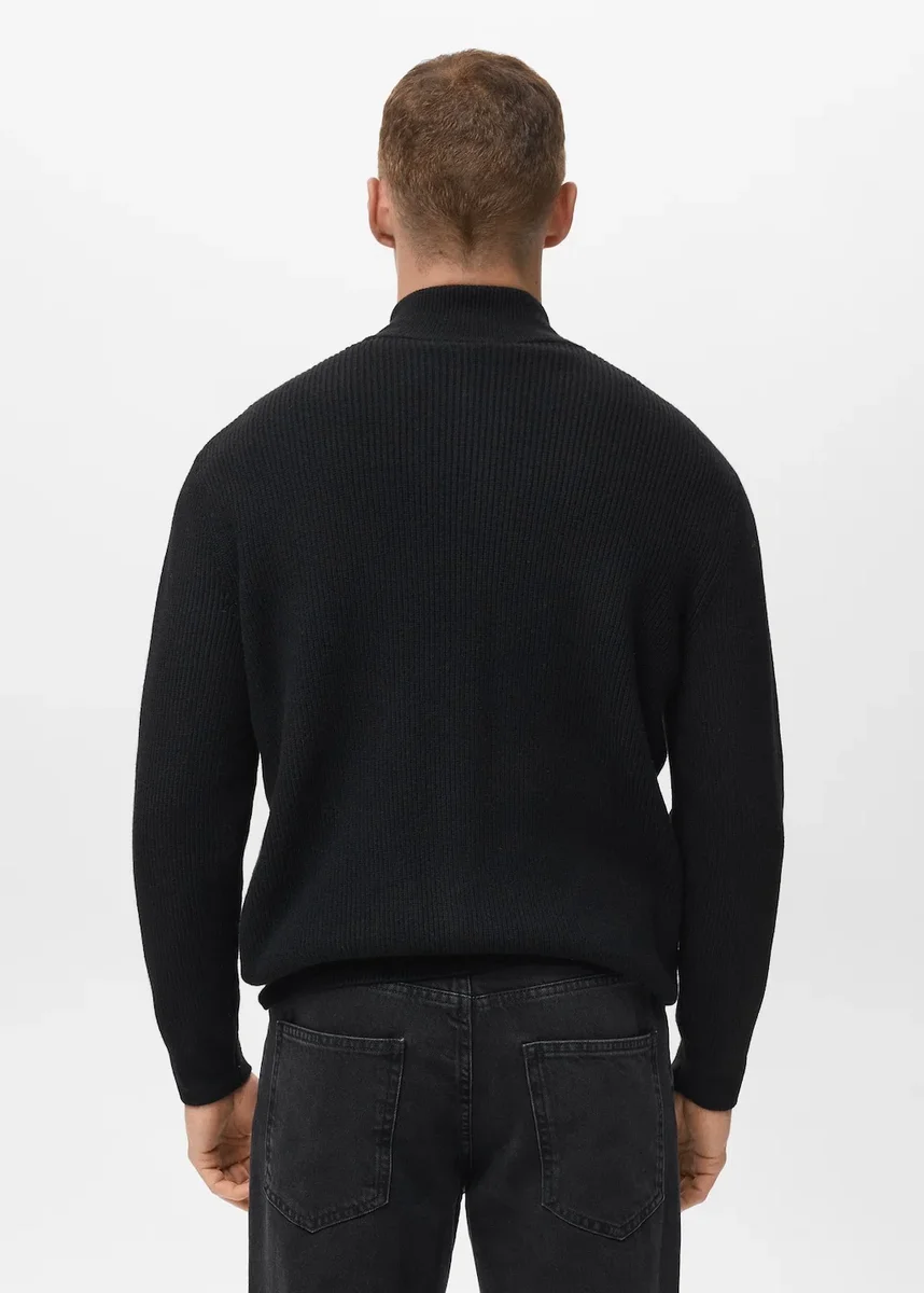 Prosty krój. Dzianina prążkowana. Materiał z domieszką wełny. Okrągły dekolt z zapięciem na zamek błyskawiczny. Długie rękawy z elastycznymi mankietami. Prosty dół. Czarny piątek.