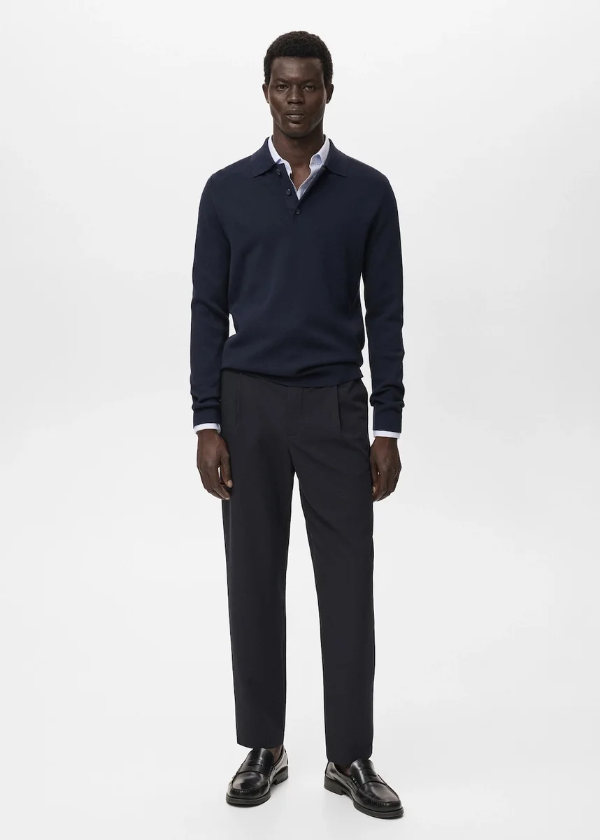 Prosty krój. Cienka dzianina. Kołnierzyk polo zapinany na guziki. Prążkowany kołnierzyk, rękawy i dół. Długi rękaw