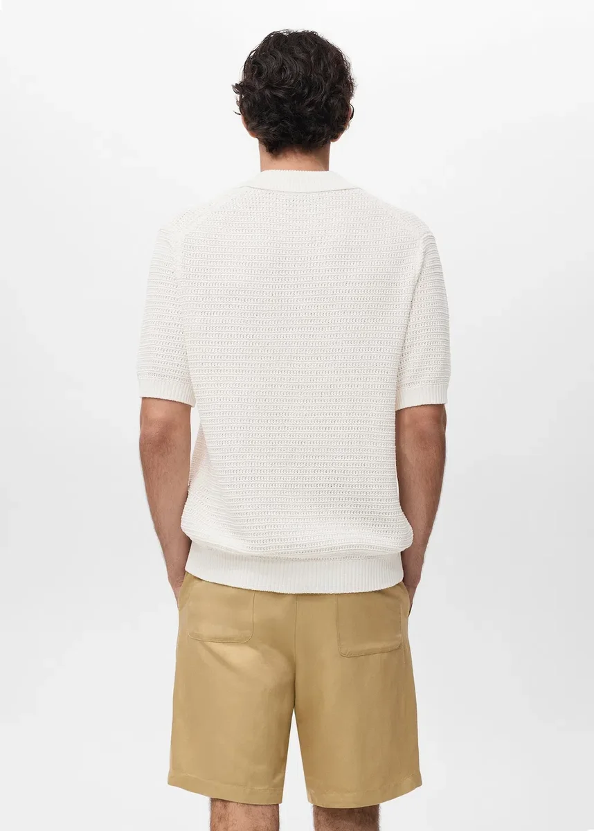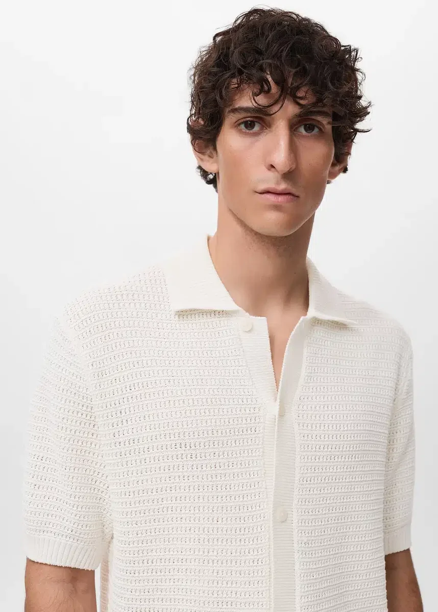 Krój regularny. Tkanina z mieszanki bawełny. Delikatna dzianina z paskami z oczkami. Zapięcie na guziki z przodu. Ściągacz na kołnierzu, rękawach, plisie i u dołu. Prosty dół. Produkt promocyjny.