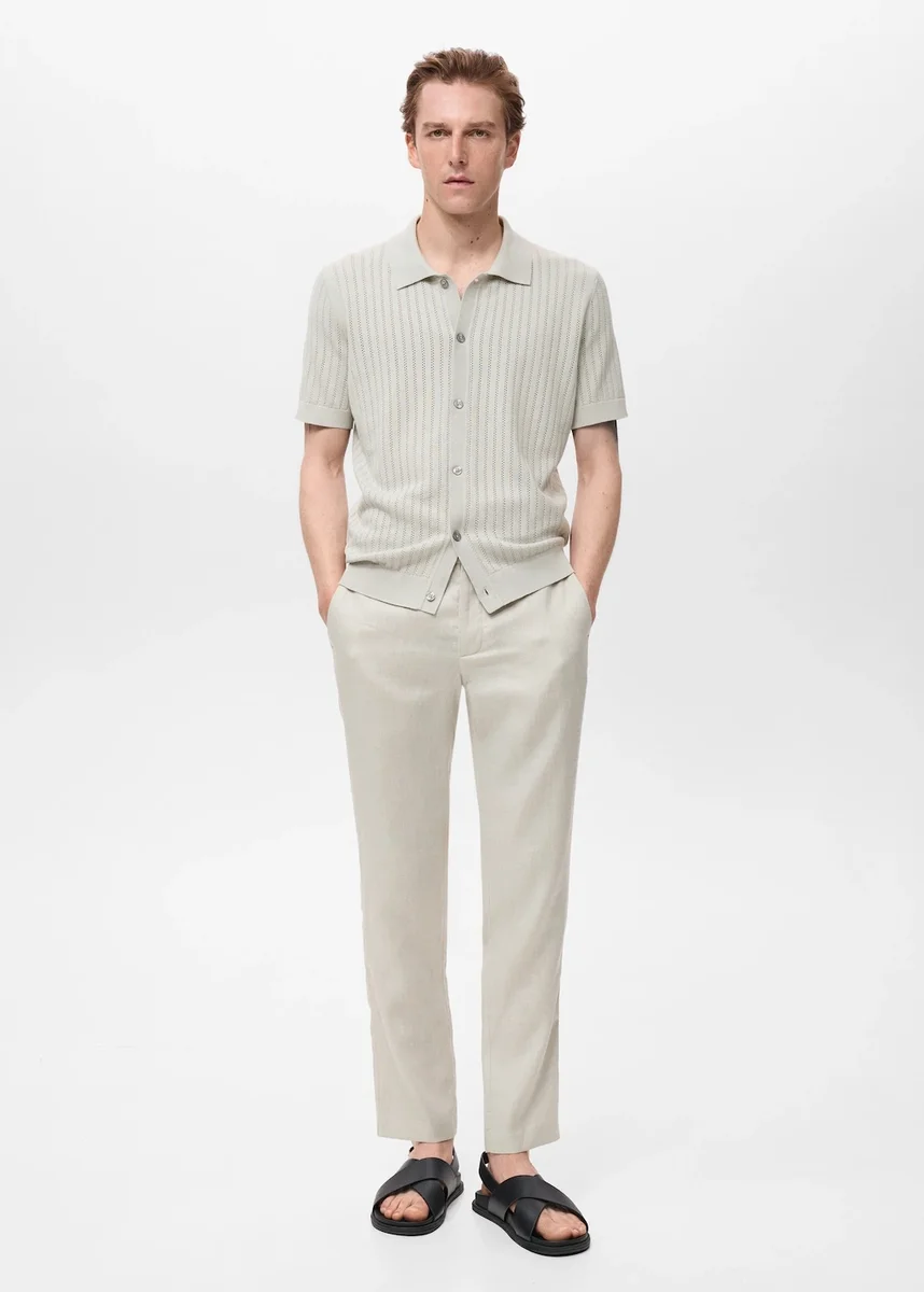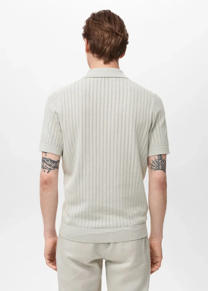 Prosty krój. 100% bawełna. Delikatna dzianina z koronkowymi akcentami. Kołnierzyk koszulowy. Krótki rękaw. Prążkowany kołnierzyk, rękawy i dół. Zapięcie na guziki z przodu.