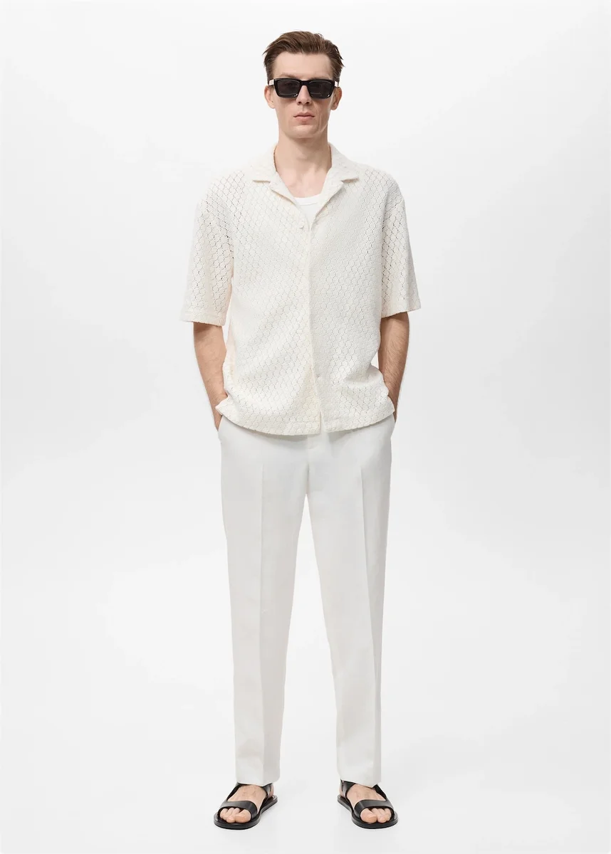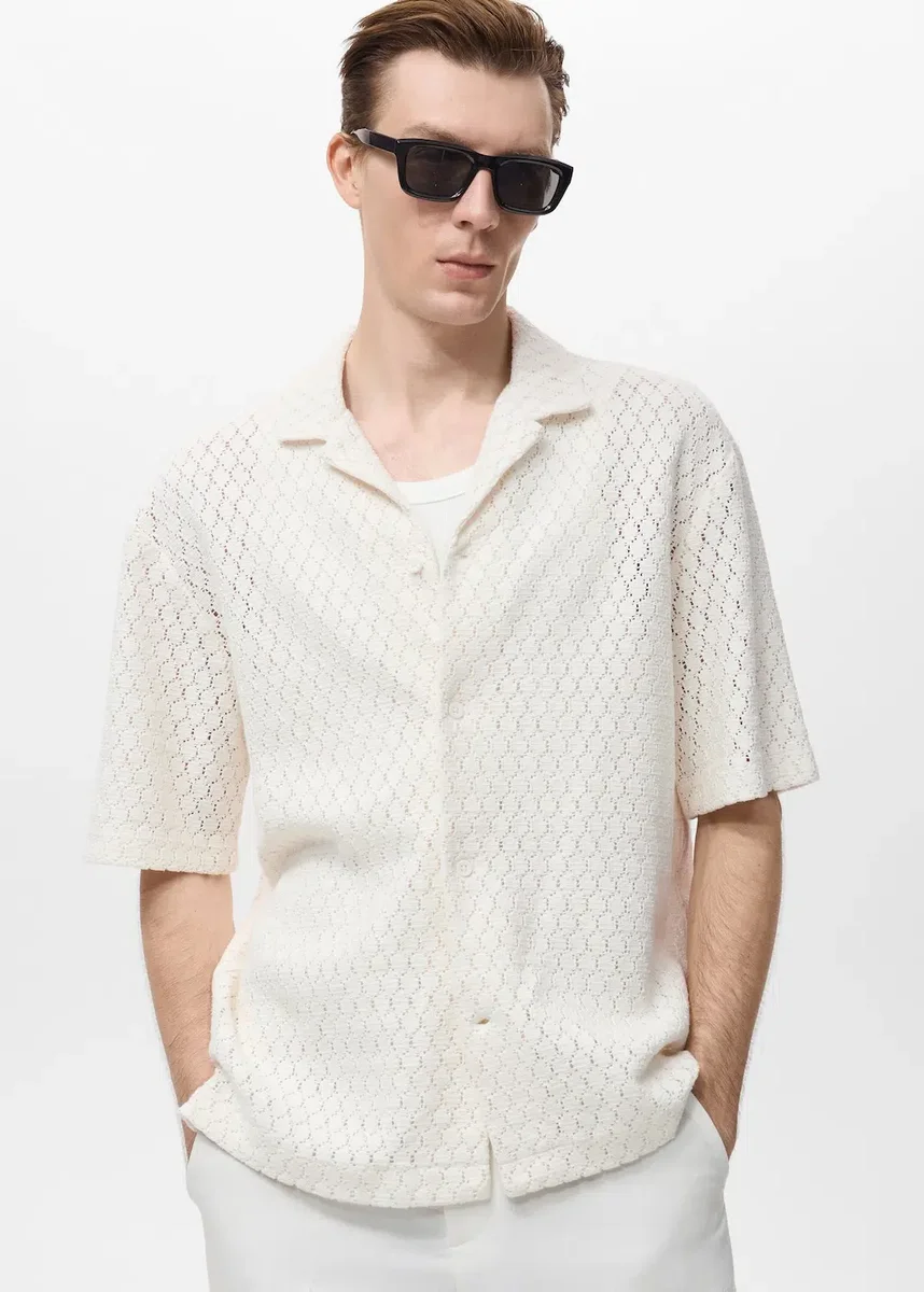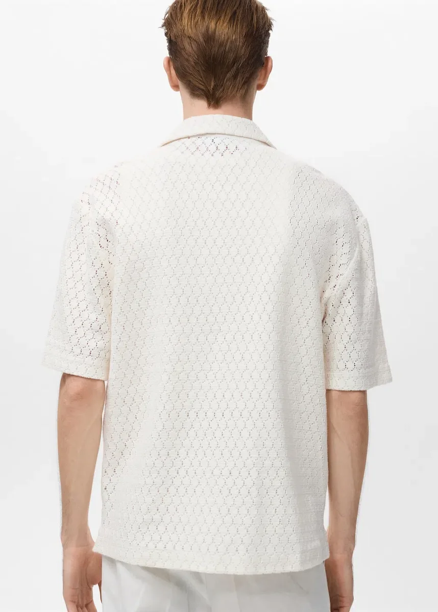 100% bawełna. Regularny krój. Ażurowa dzianina. Kołnierzyk typu bowling. Krótki rękaw. Zapięcie na guziki z przodu. Prosty dół. Małe rozcięcia po bokach u dołu.