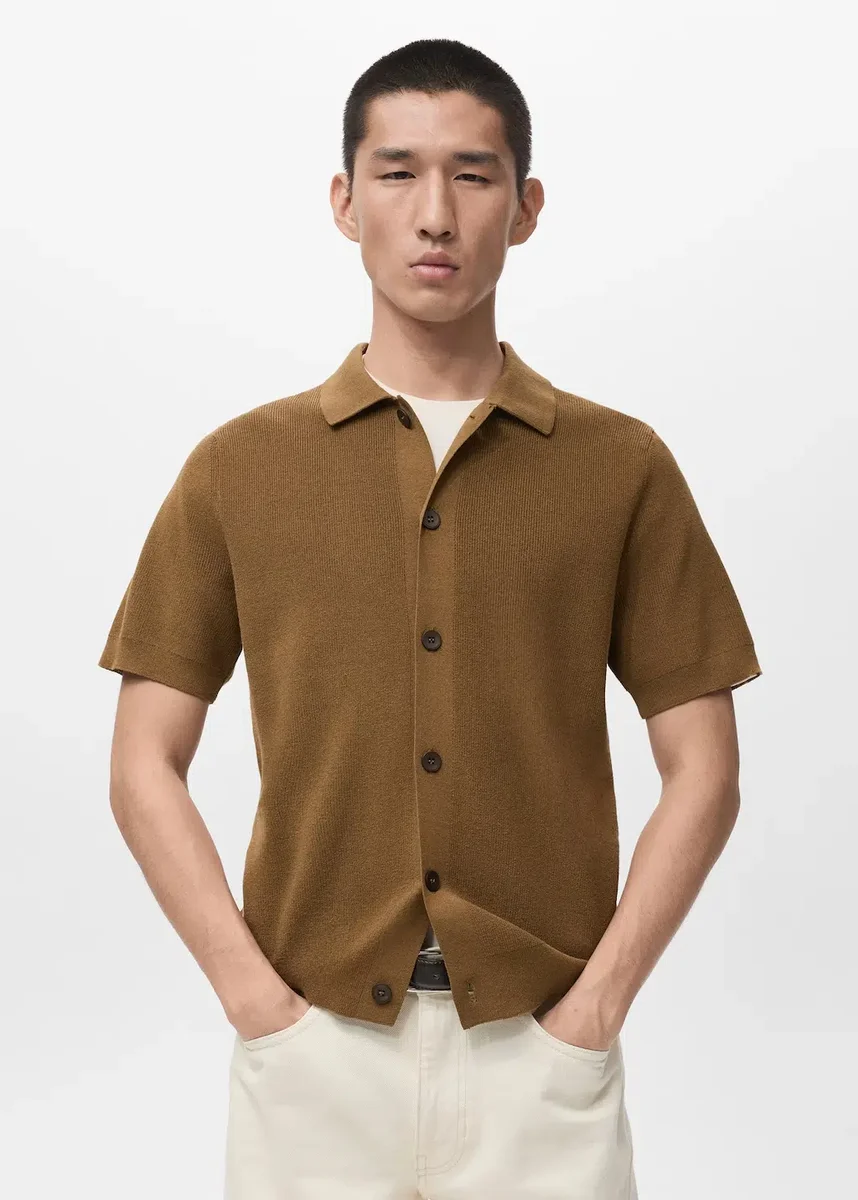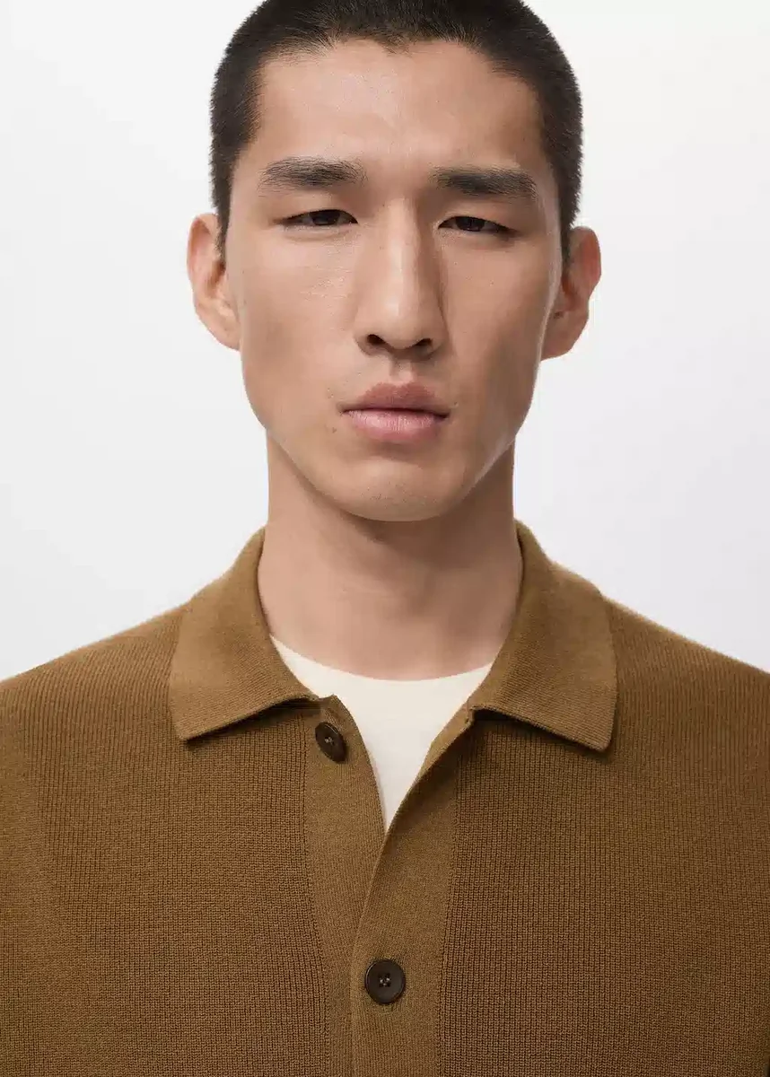 Regularny krój. Tkanina z mieszanki bawełny. Strukturalna dzianina. Kołnierzyk koszulowy. Prążkowany kołnierzyk, rękawy i dół. Zapięcie na guziki z przodu