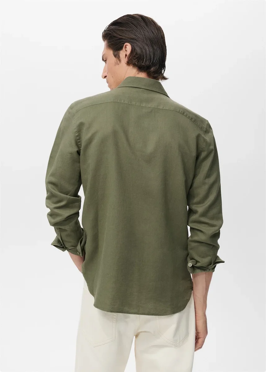 Krój regularny. Mieszanka lnu i bawełny. Kołnierzyk koszulowy. Naszywana kieszeń na piersi. Długie rękawy z mankietami zapinanymi na guziki. Zapięcie na guziki z przodu.