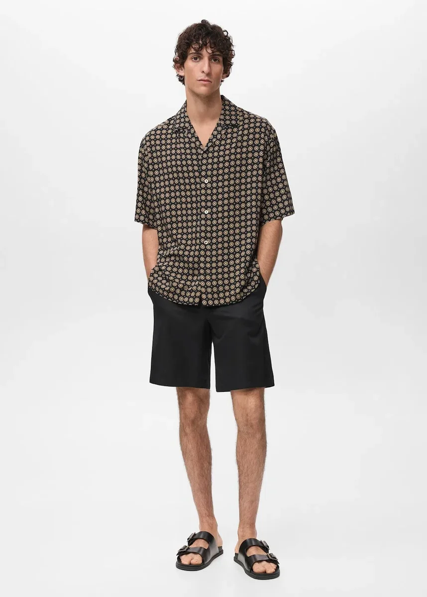 100% wiskoza. Regularny krój. Płynny materiał. Kołnierzyk typu bowling. Zapięcie na guziki z przodu. Krótkie rękawy. Prosty dół.