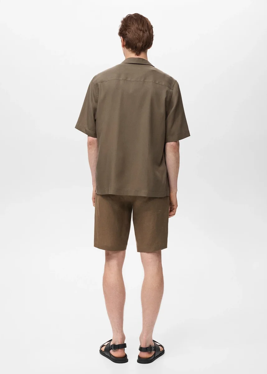 Regularny krój. Kołnierzyk typu bowling. Zapięcie na guziki z przodu. Krótkie rękawy. Naszywana kieszeń na piersi. Prosty dół. Materiał lyocell.