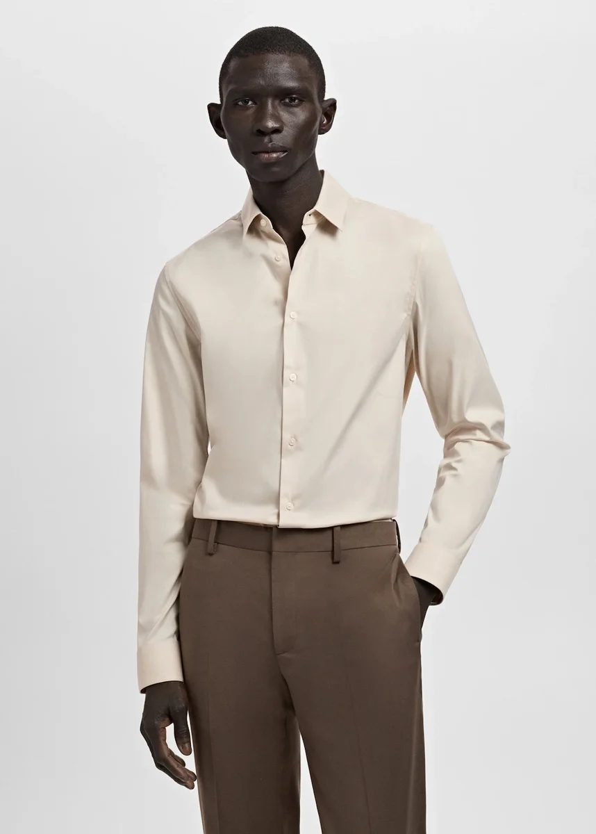 Kołnierzyk koszulowy z klapami. Dopasowany krój. Elastyczna tkanina bawełniana. Klasyczny kołnierzyk. Zapięcie na guziki z przodu. Długie rękawy z mankietami zapinanymi na guziki. Zaokrąglony dół. Standardowa długość. Długie rękawy. Lekka, płaska struktura. Zapięcie z przodu. Sylwetka Super Slim Fit