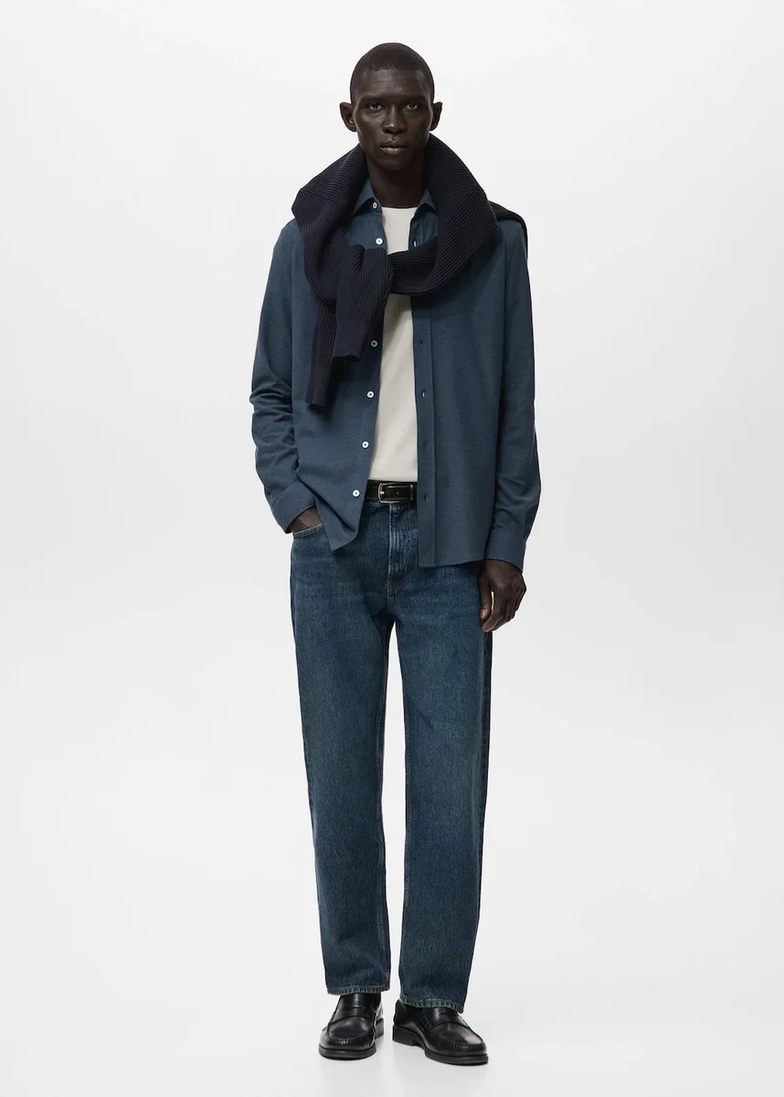 Krój slim fit. 100% bawełna. Kołnierzyk koszulowy. Długie rękawy z mankietami zapinanymi na guziki. Zapięcie na guziki z przodu. Prosty dół.