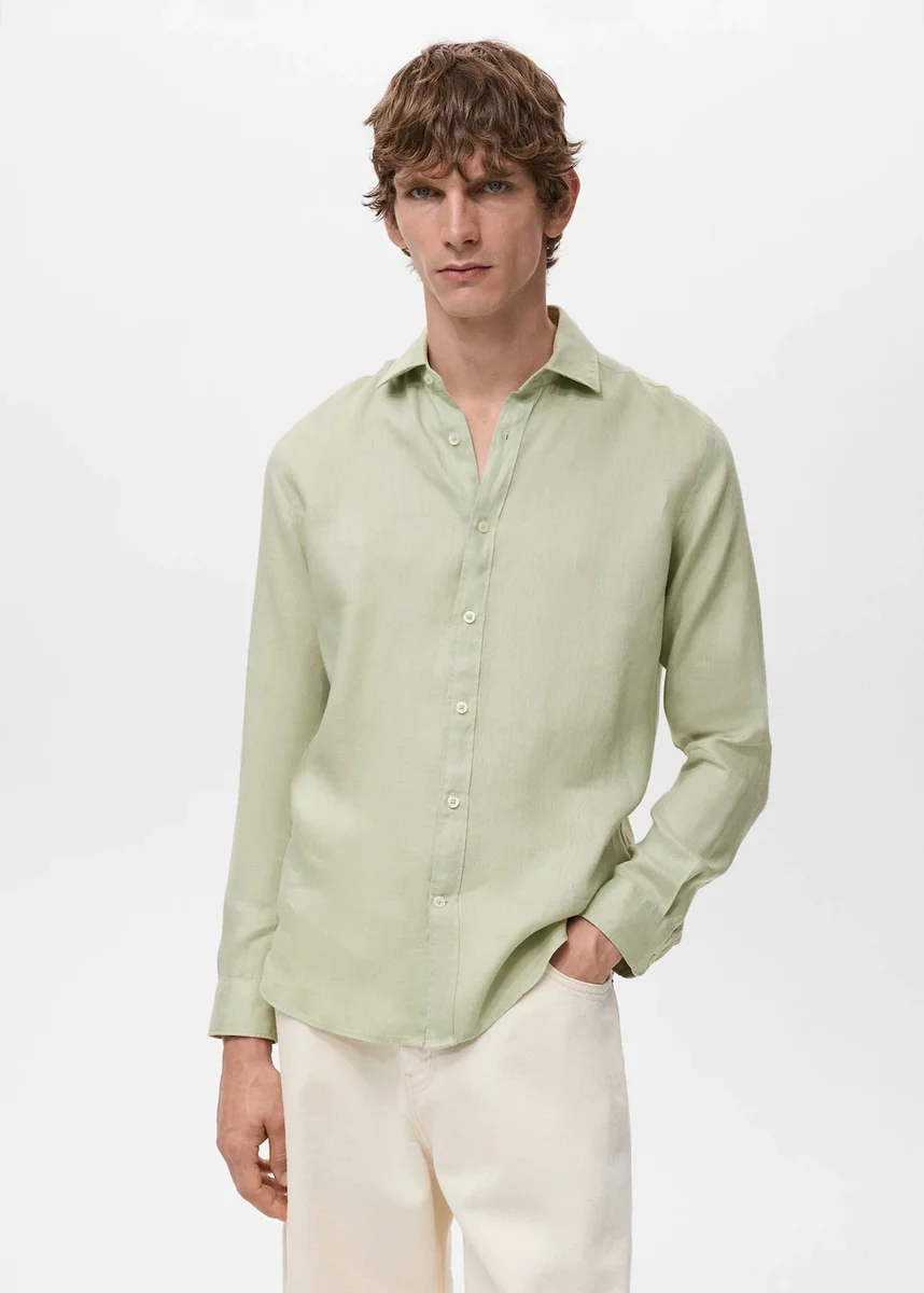 Regularny krój. 100% len. Kołnierzyk koszulowy. Zapięcie na guziki z przodu. Długie rękawy z mankietami zapinanymi na guziki. Zaszewka z tyłu. Zaokrąglony dół. Kolor jasnoniebieski jest dostępny wyłącznie w sprzedaży internetowej. Model w kolorze porcelanowym jest dostępny wyłącznie w sprzedaży internetowej.