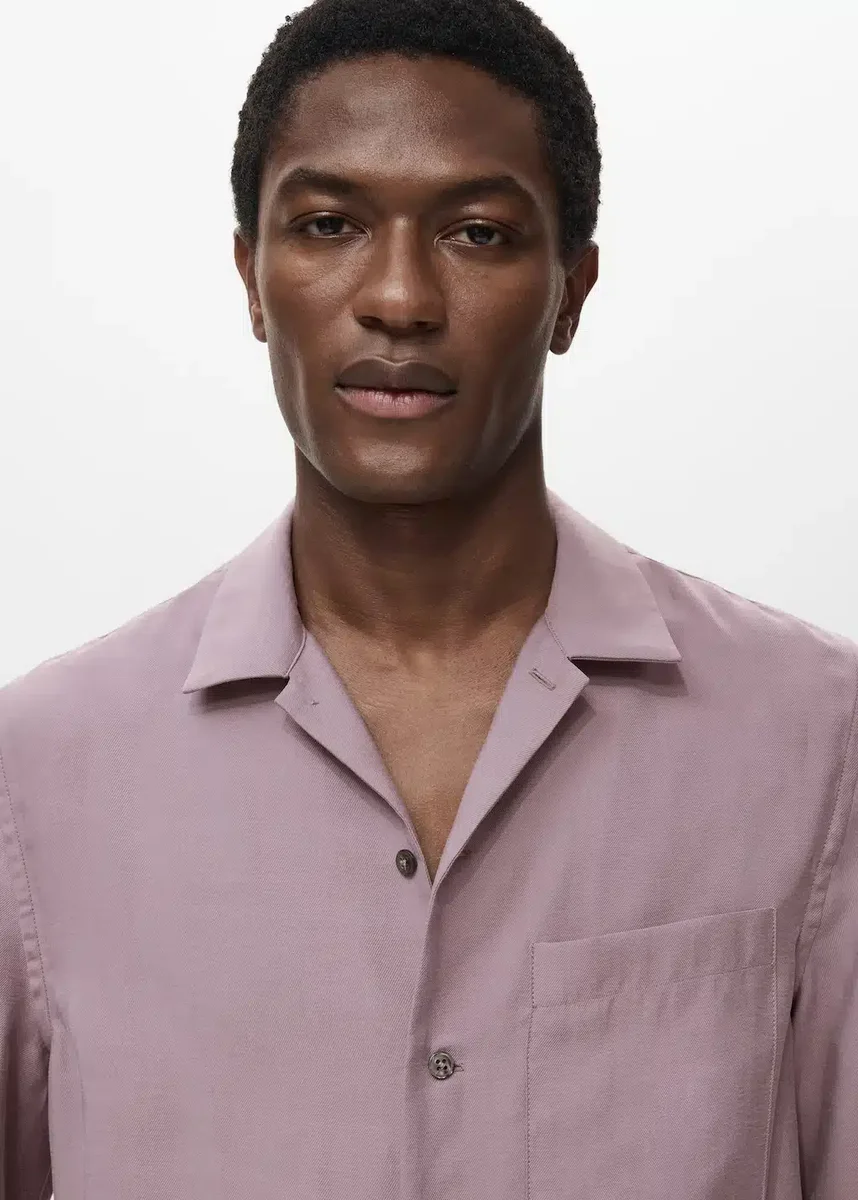 Tkanina lyocell. Regularny krój. Kołnierzyk typu bowling. Naszywana kieszeń na piersi. Zapięcie na guziki z przodu. Krótkie rękawy.