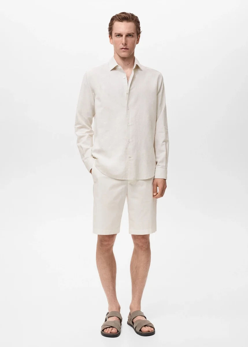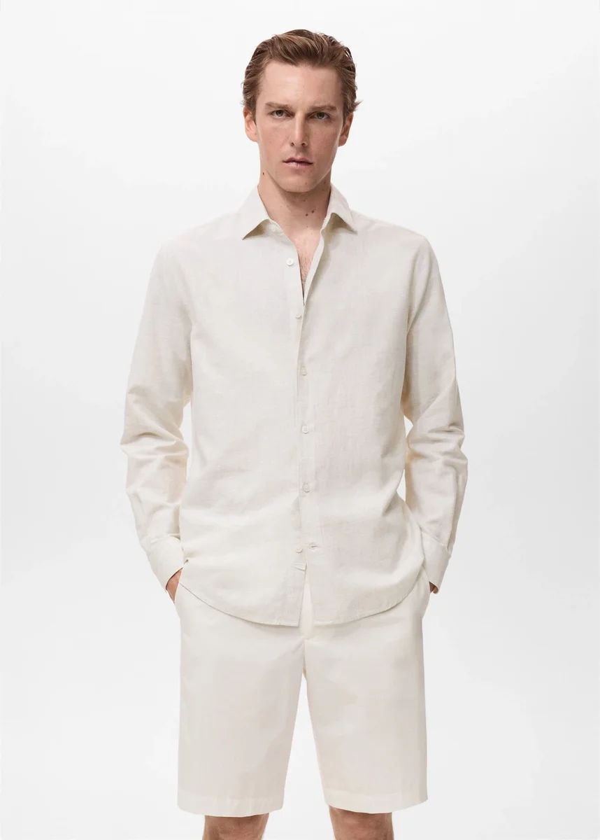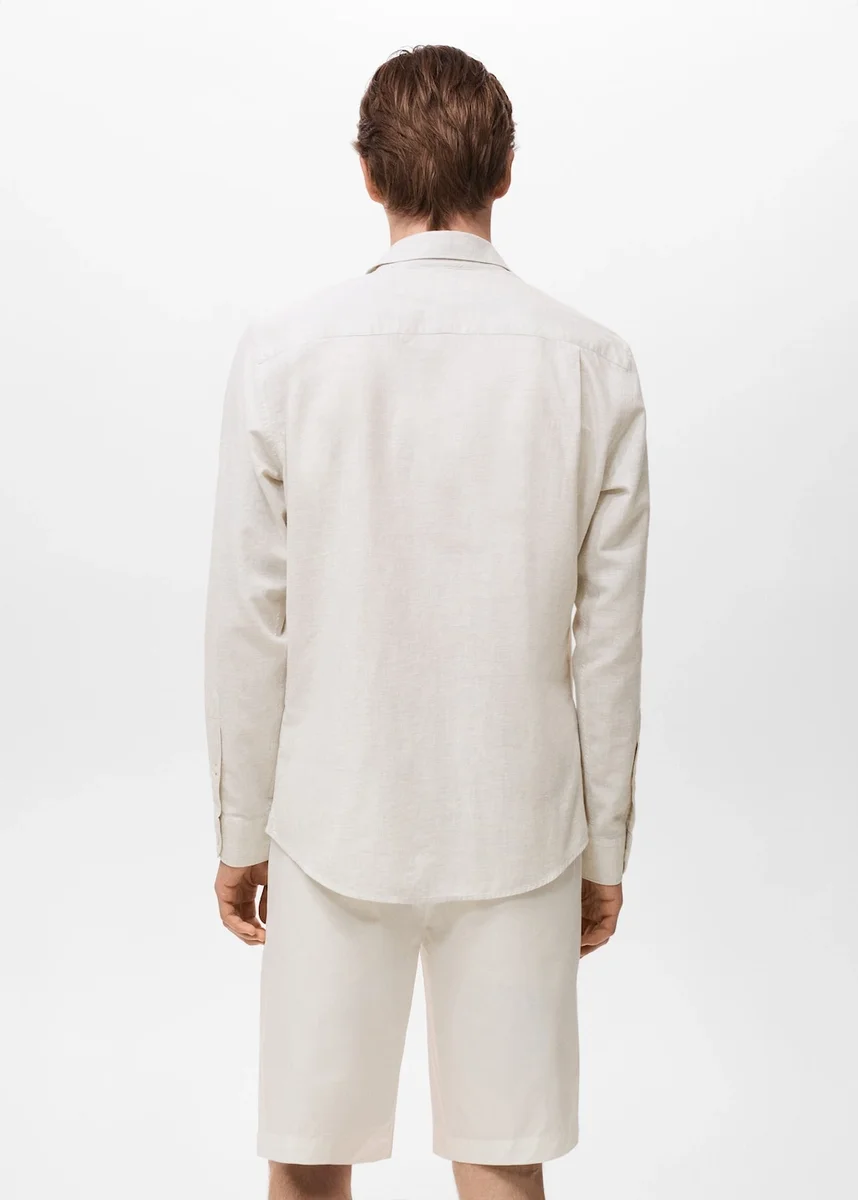 Regularny krój. Tkanina bawełniano-lniana. Kołnierzyk koszulowy. Zapięcie na guziki z przodu. Długie rękawy z mankietami zapinanymi na guziki. Zaszewka z tyłu. Zaokrąglony dół.