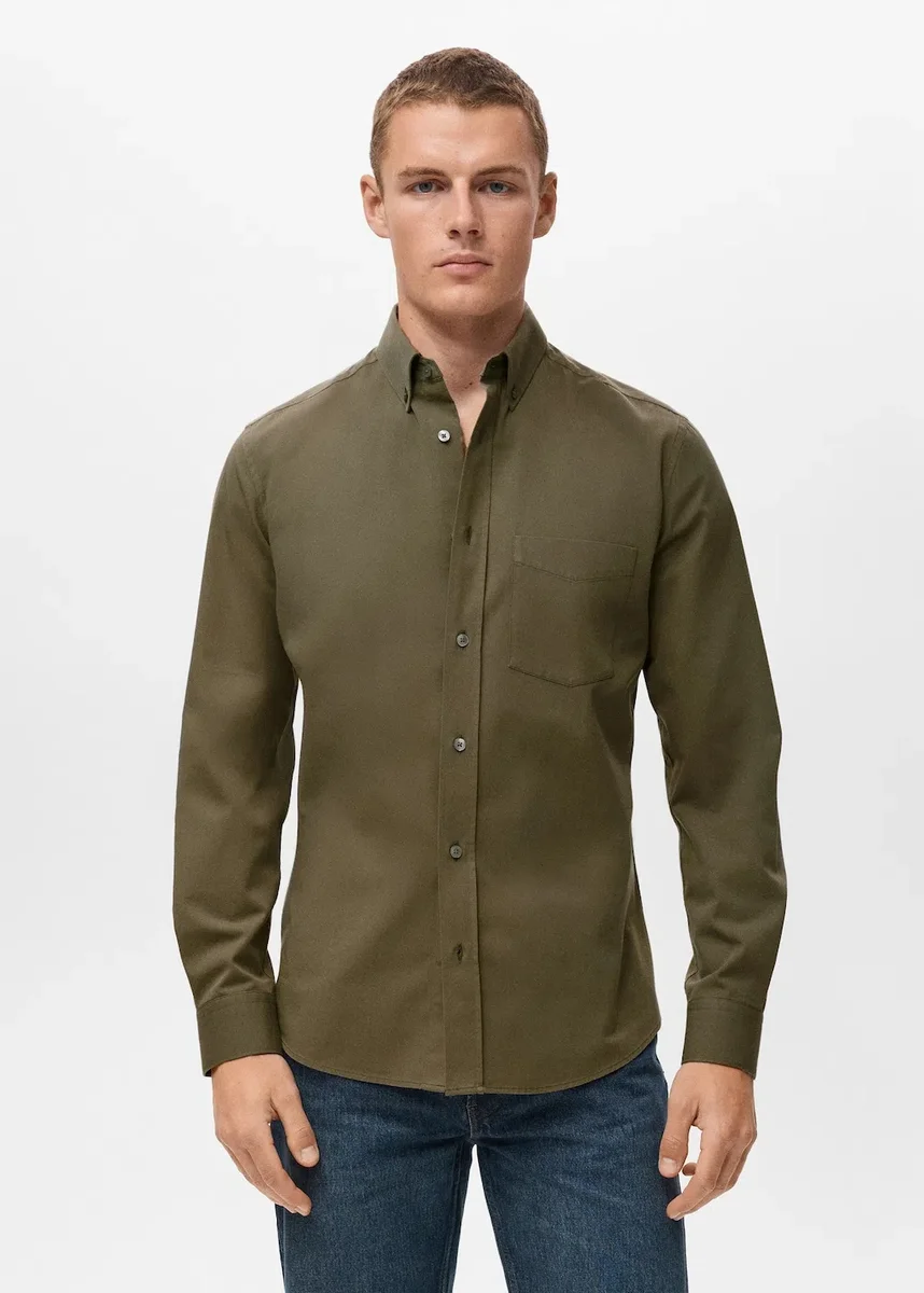 Krój regularny. 100% bawełna. Kołnierzyk zapinany na guziki. Naszywana kieszeń na piersi. Długie rękawy zapinane na guziki. Zapięcie na guziki z przodu.