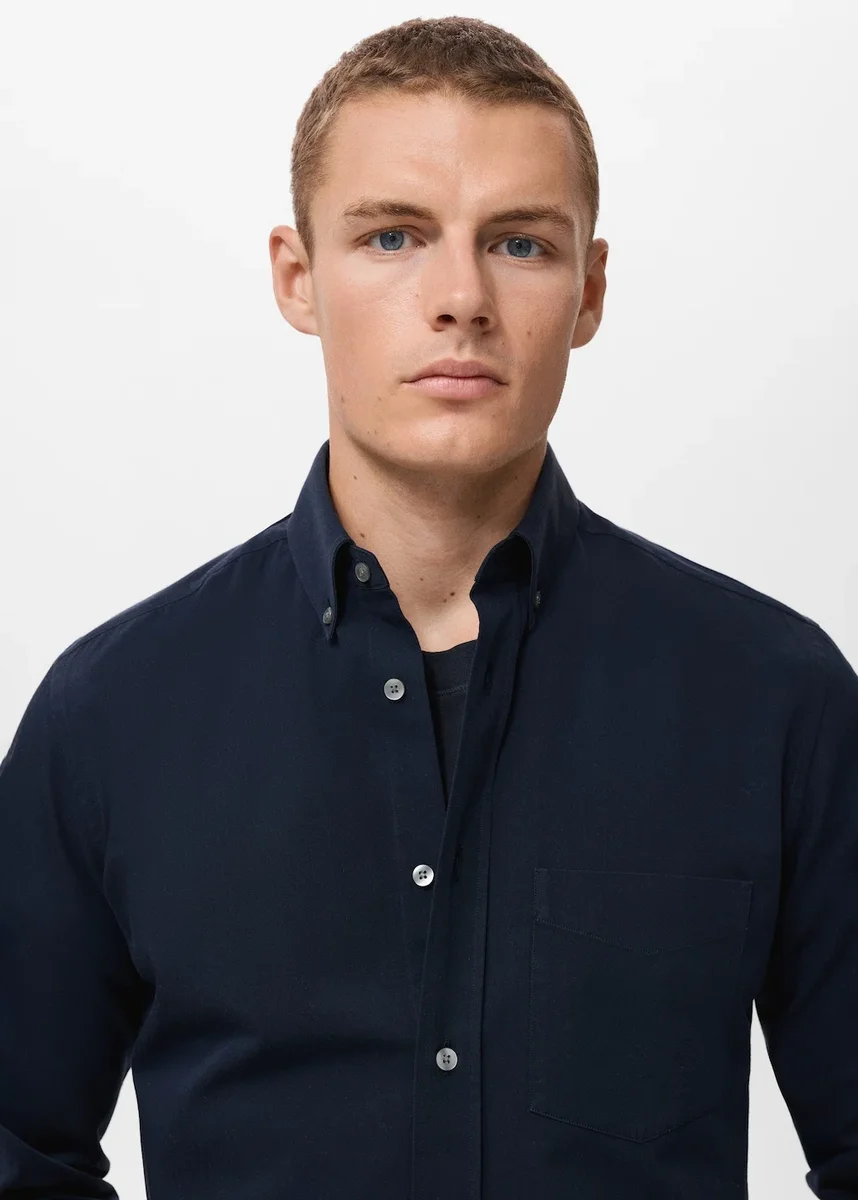 Krój regularny. 100% bawełna. Kołnierzyk zapinany na guziki. Naszywana kieszeń na piersi. Długie rękawy zapinane na guziki. Zapięcie na guziki z przodu.