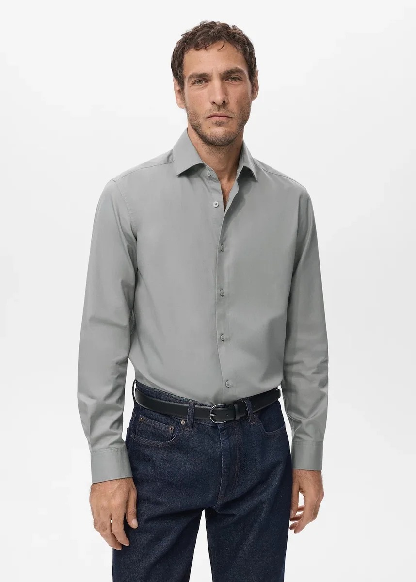 Krój slim fit. Tkanina z mieszanki bawełny i lyocellu. Kołnierzyk koszulowy. Długie rękawy z mankietami zapinanymi na guziki. Zapięcie na guziki z przodu. Zaokrąglony dół.