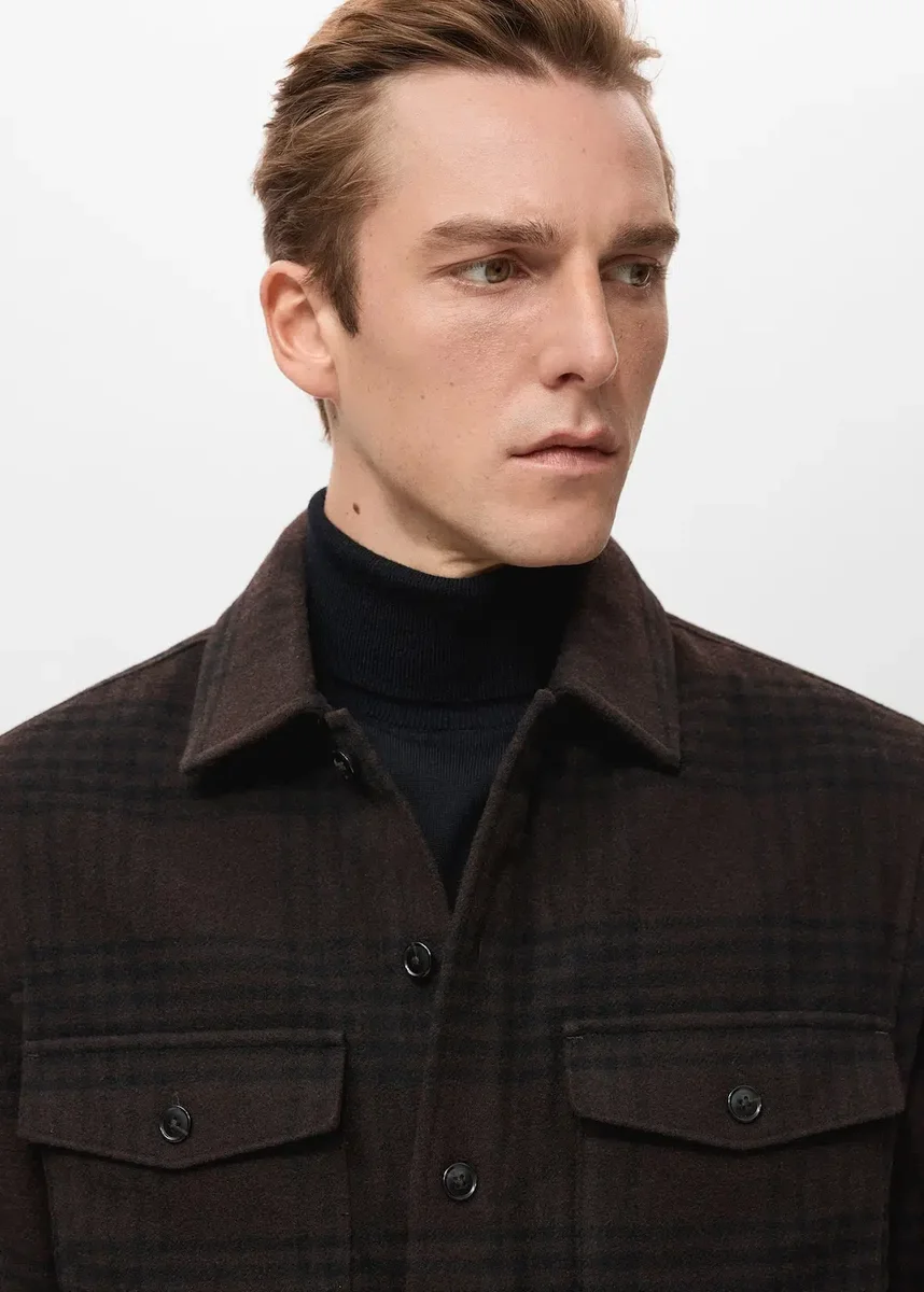 Regularny krój. Tkanina z domieszką wełny. Wzór w kratkę. Kołnierzyk koszulowy. Dwie naszywane kieszenie z patką i guzikiem z przodu. Długie rękawy z mankietami zapinanymi na guziki. Zapięcie na guziki z przodu.