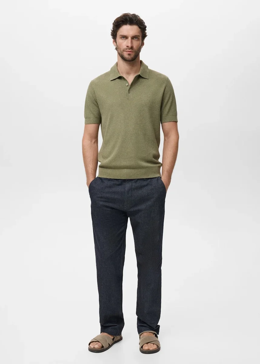 Krój regularny. Prążkowany wzór. Kołnierzyk polo zapinany na guziki. Prążkowane wykończenia. Prosty dół.