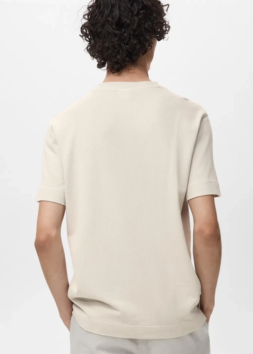 100% bawełna. Regularny krój. Dzianina o drobnym wzorze w jodełkę. Okrągły dekolt. Krótki rękaw. Prosty dół. Czarny piątek