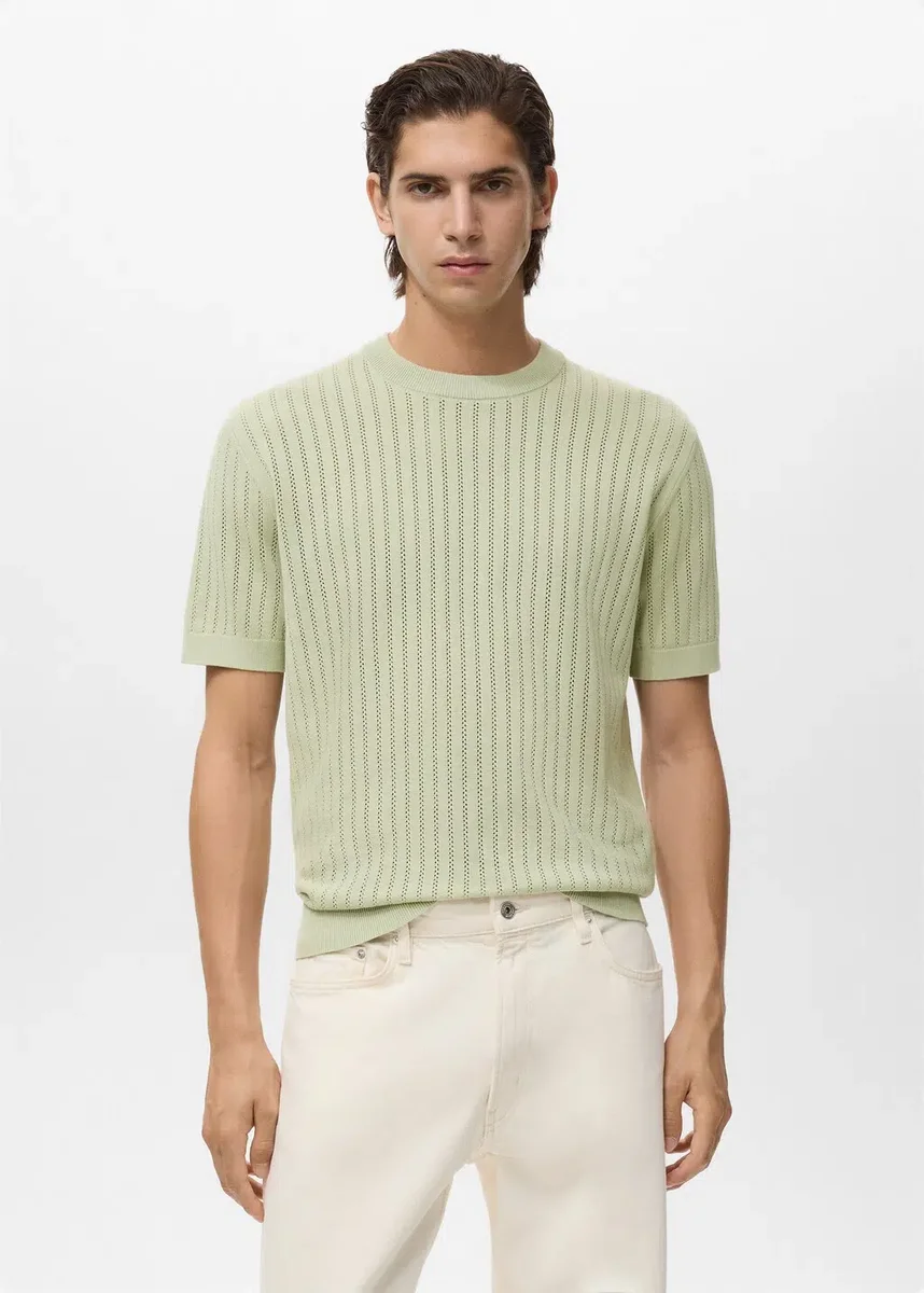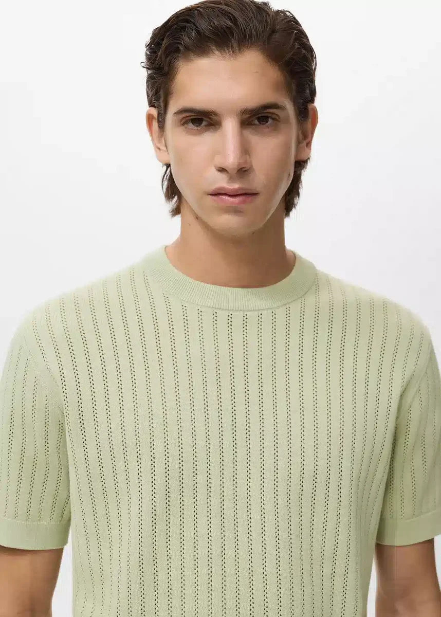 Wykonana w 100% z bawełny, ta koszulka ma regularny krój i drobny splot z paskami ażurowymi. Dekolt, rękawy i dół wykończone są prążkowanym ściągaczem. Model ma 190 cm wzrostu i nosi rozmiar M.