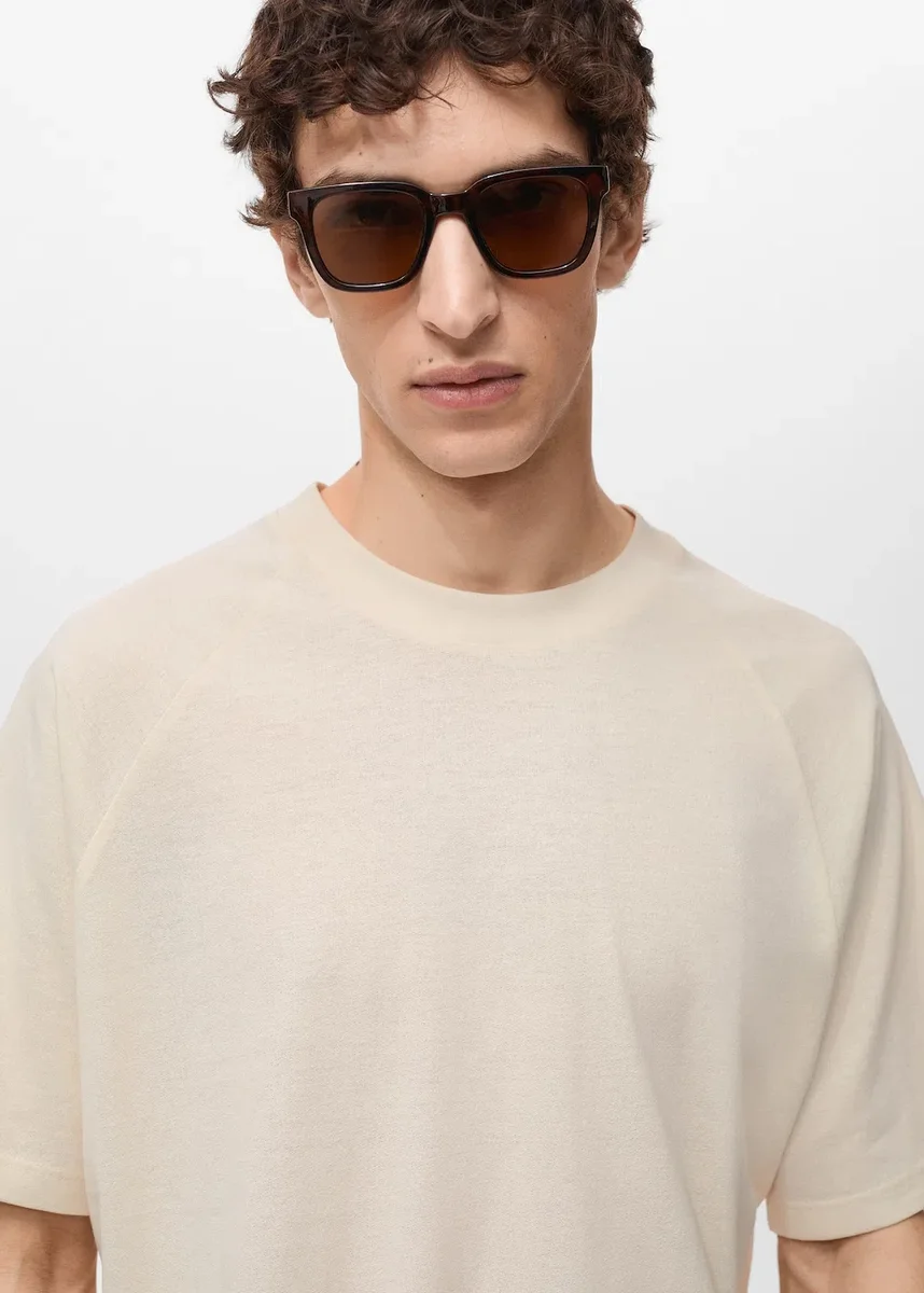 Ta luźna koszulka łączy w sobie bawełnę i len, zapewniając komfort noszenia. Ma okrągły dekolt, krótkie rękawy i szwy ozdobne. Prosty dół dopełnia projekt. Model ma 190 cm wzrostu i nosi rozmiar M.