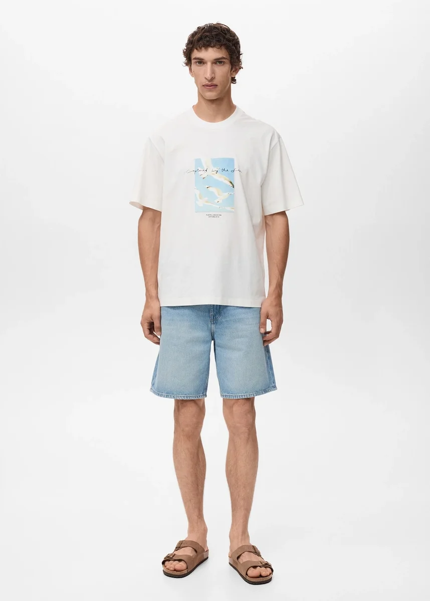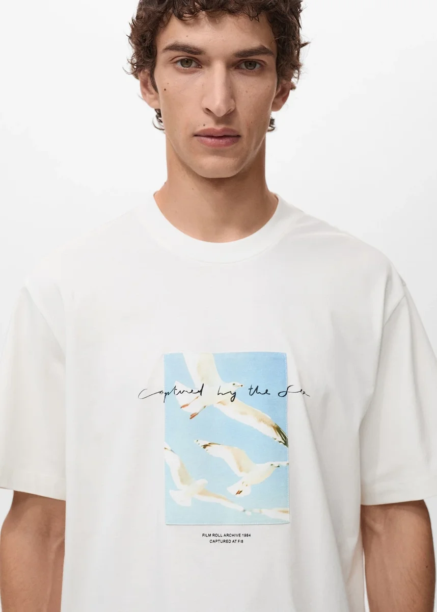 Ta luźna koszulka została wykonana w 100% z bawełny. Ma okrągły dekolt i krótkie rękawy oraz nadrukowany wzór z przodu. Model ma 190 cm wzrostu i nosi rozmiar M.