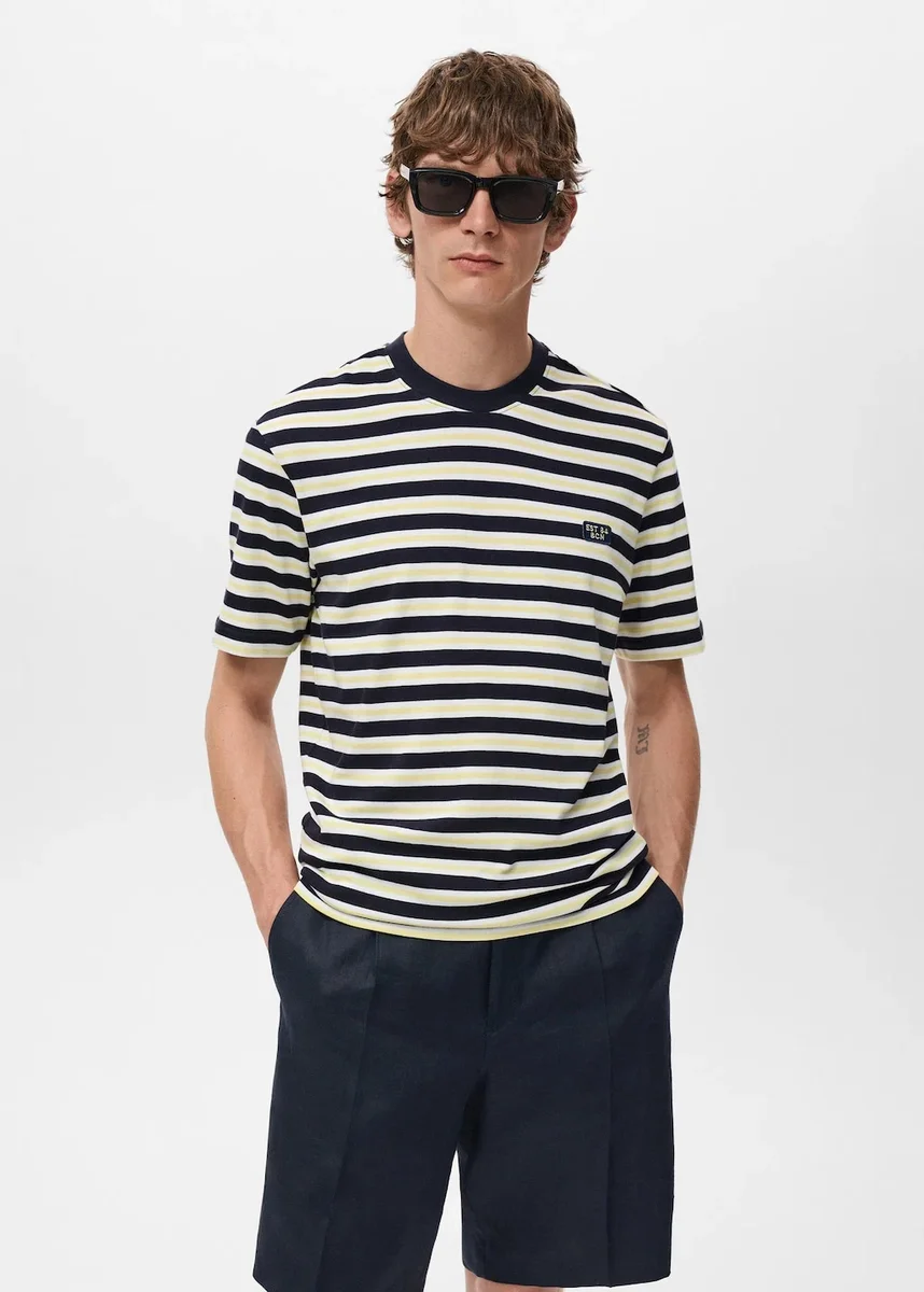 Krój regularny. 100% bawełna. Trójkolorowy wzór w paski. Otwór z tyłu. Krótkie rękawy. Prosty dół.