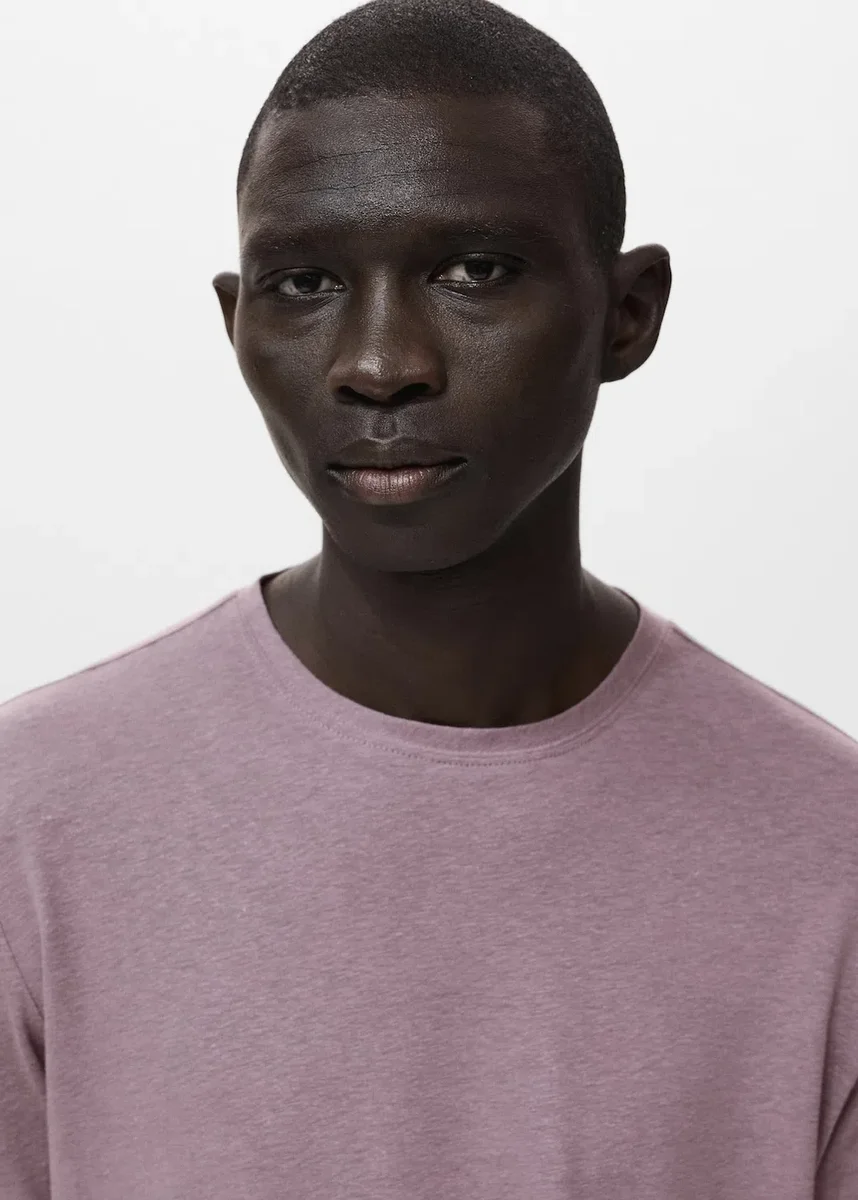Krój slim fit. Mieszanka lnu. Okrągły dekolt. Krótki rękaw. Prosty dół. Krótkie rękawy