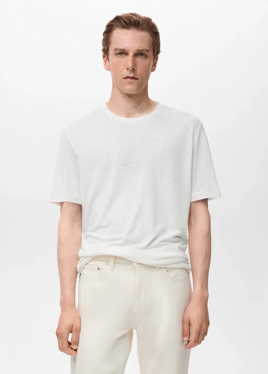 Slim fit. Tkanina z mieszanki lnu. Okrągły dekolt. Krótki rękaw. Prosty dół. Krótkie rękawy