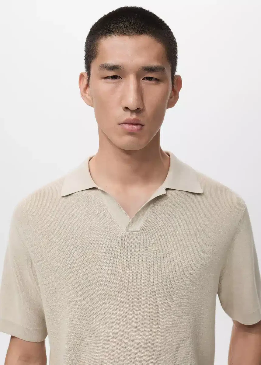 Prosty krój. Dzianina mieszana bawełna-wiskoza. Dzianina strukturalna. Koszulka polo z kołnierzem bez guzików. Krótkie rękawy. Ściągacz przy kołnierzu, rękawach i u dołu.