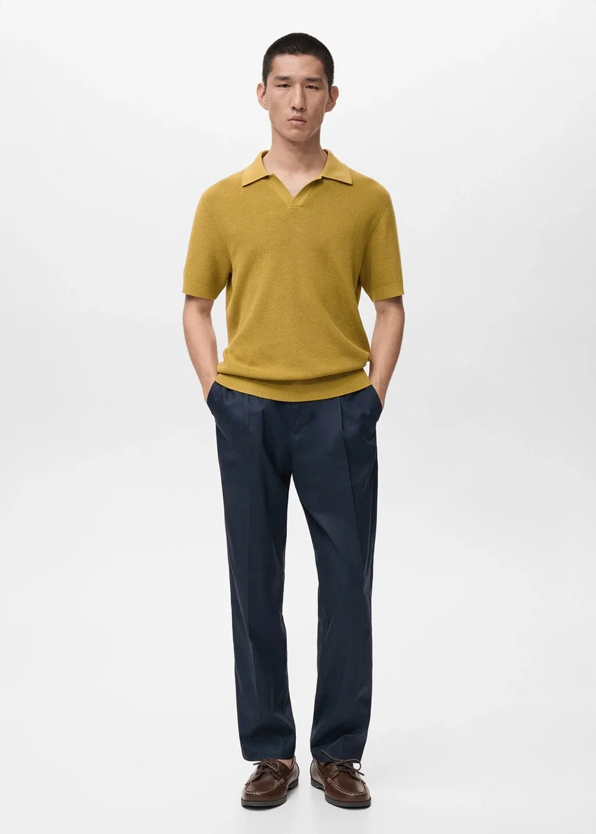 Prosty krój. Dzianina mieszana bawełna-wiskoza. Dzianina strukturalna. Koszulka polo z kołnierzem bez guzików. Krótkie rękawy. Ściągacz przy kołnierzu, rękawach i u dołu.