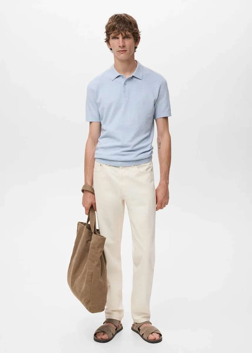 Krój slim fit. Tkanina z mieszanki bawełny. Cienka dzianina o mikrostrukturze. Kołnierzyk polo zapinany na guziki. Krótkie rękawy. Ściągacze na rękawach i u dołu. Prosty dół.