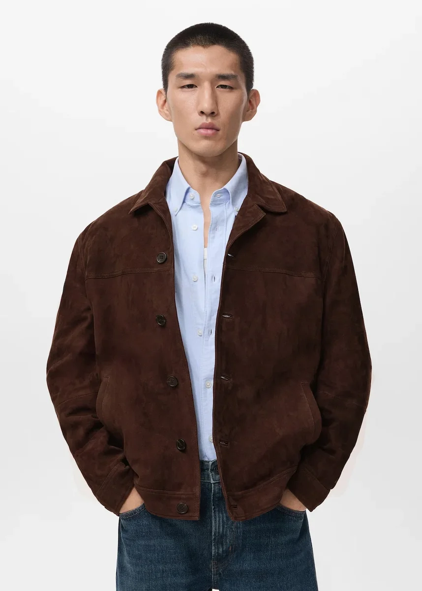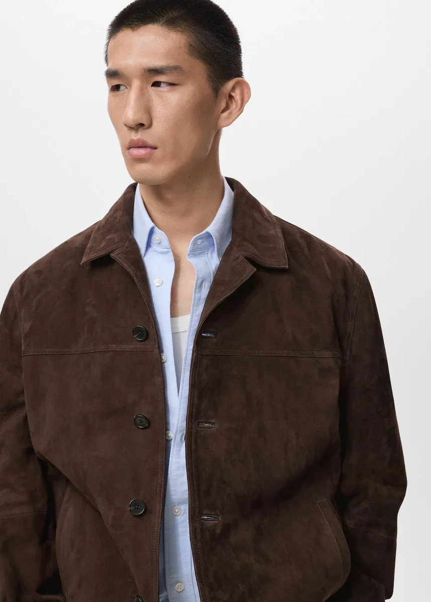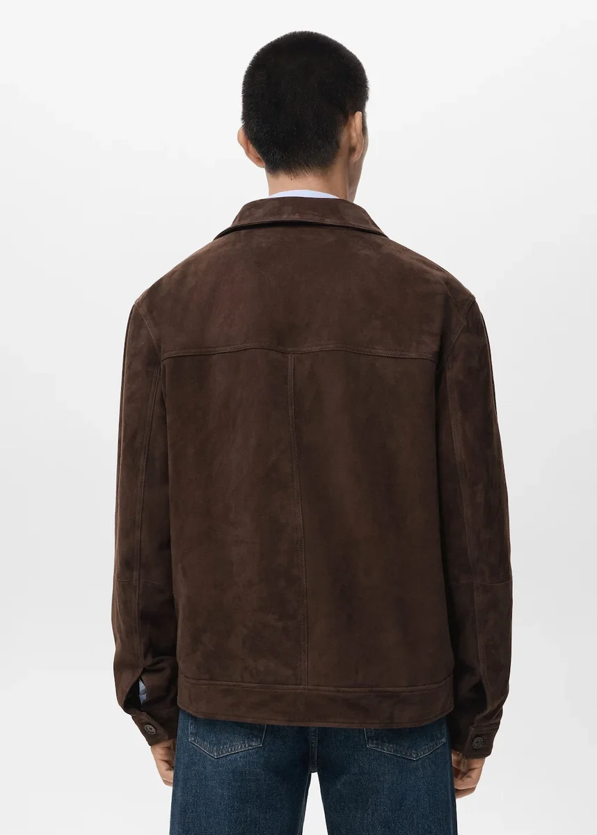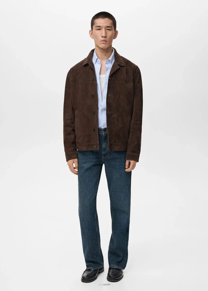 Kolekcja Casper Ruud x Mango. 100% skóra koźla. Prosty krój. Kołnierzyk w kształcie litery V w stylu koszuli. Dwie kieszenie boczne. Długie rękawy z mankietami zapinanymi na guziki. Zapięcie z przodu na guziki. Prosty dół.
