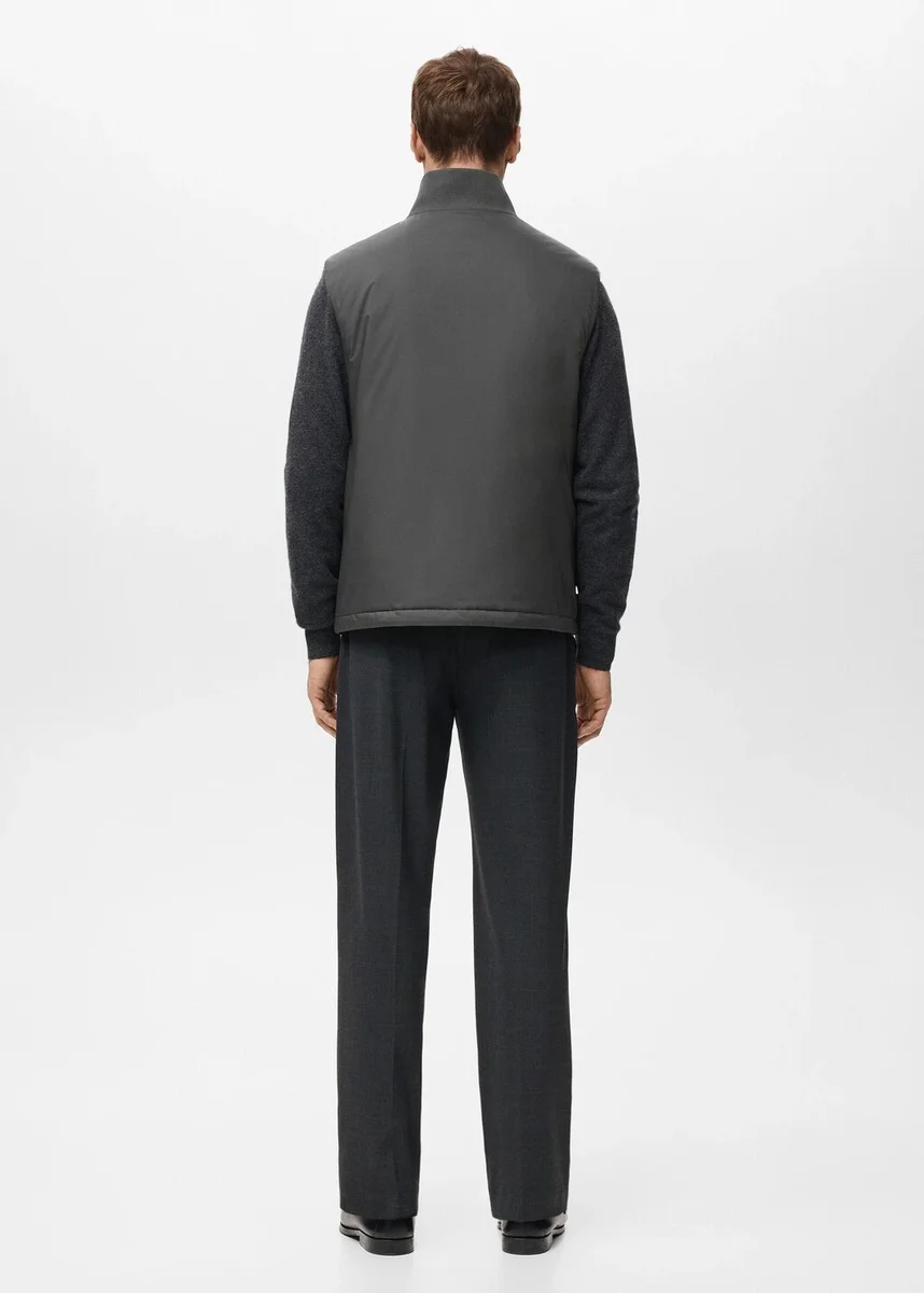 Prosty krój. Pikowana konstrukcja. Kołnierz z dzianiny warkoczowej. Dwie przednie kieszenie. Wewnętrzna kieszeń z wypustką. Bez rękawów. Zapięcie na zamek błyskawiczny z przodu.