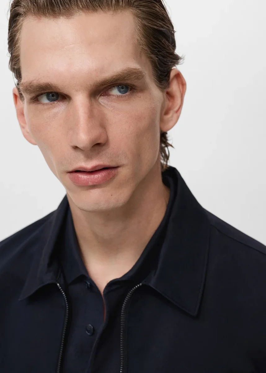 Krój slim fit. Tkanina z mieszanki bawełny. Kołnierzyk koszulowy. Zapięcie na zamek błyskawiczny z przodu. Mankiety zapinane na guziki. Dwie kieszenie boczne zapinane na zatrzask. Prosty dół.