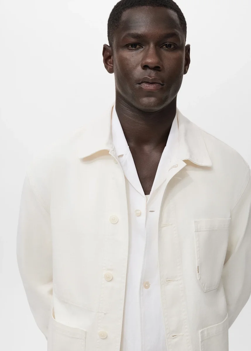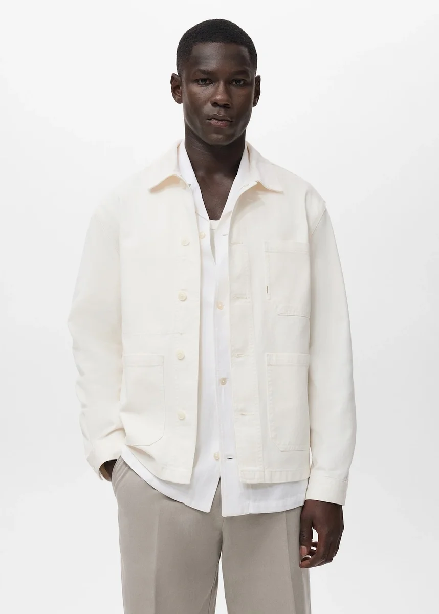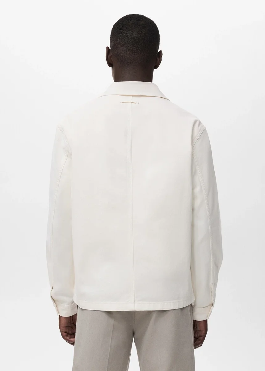 Prosty krój. 100% bawełna dżinsowa. Kołnierzyk koszulowy. Trzy naszywane kieszenie z przodu. Długie rękawy z mankietami zapinanymi na guziki. Zapięcie na guziki z przodu. Prosty dół.