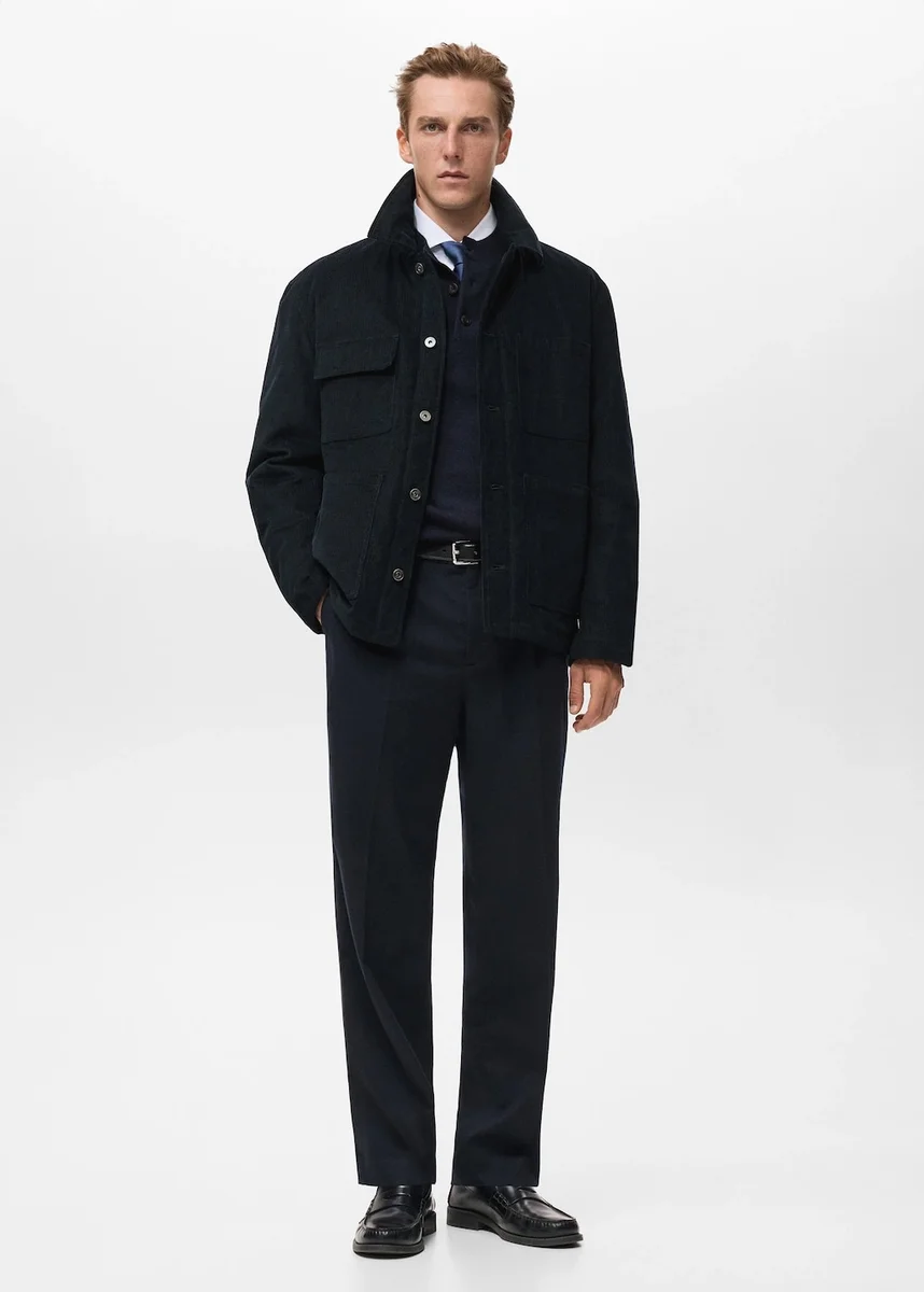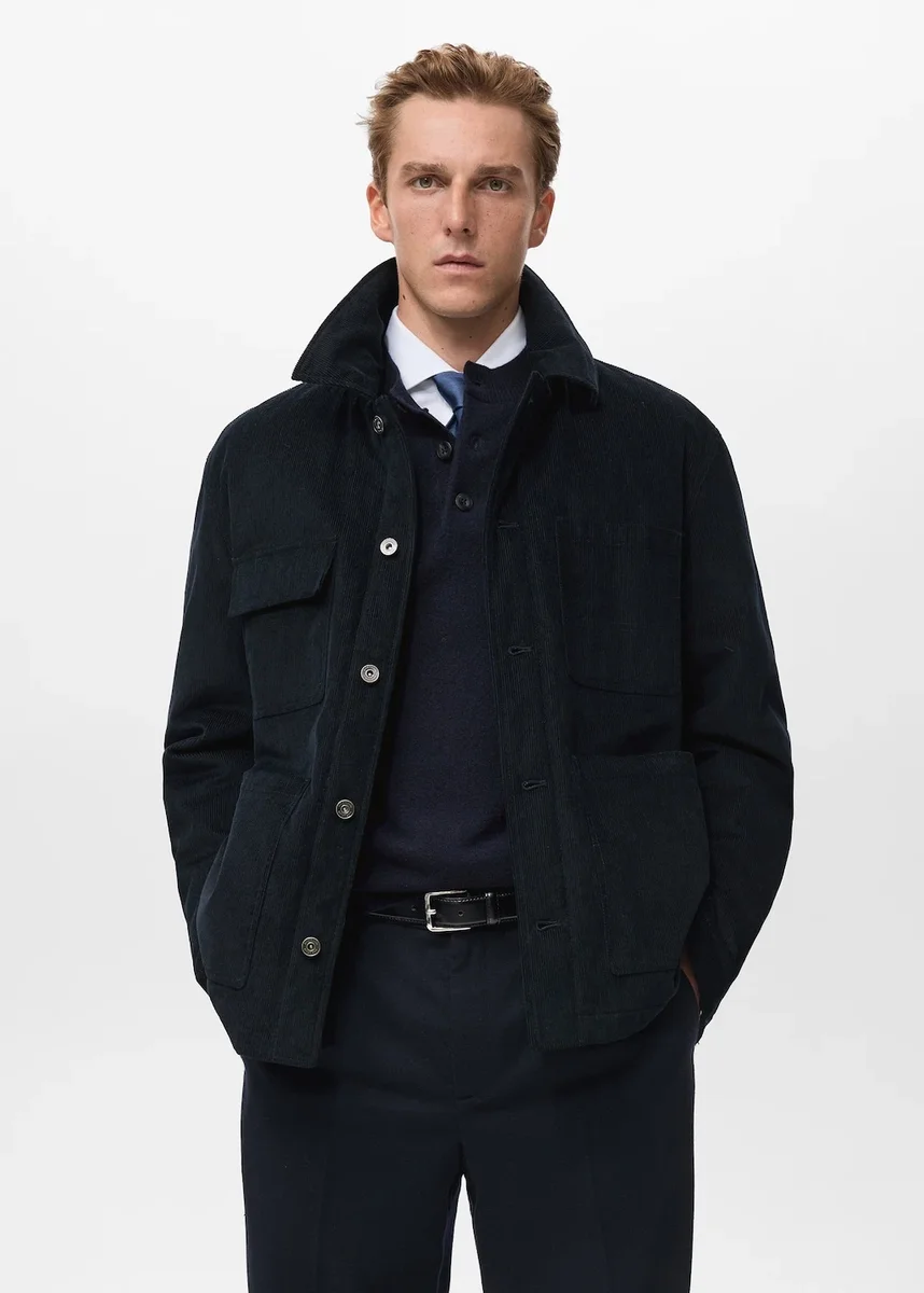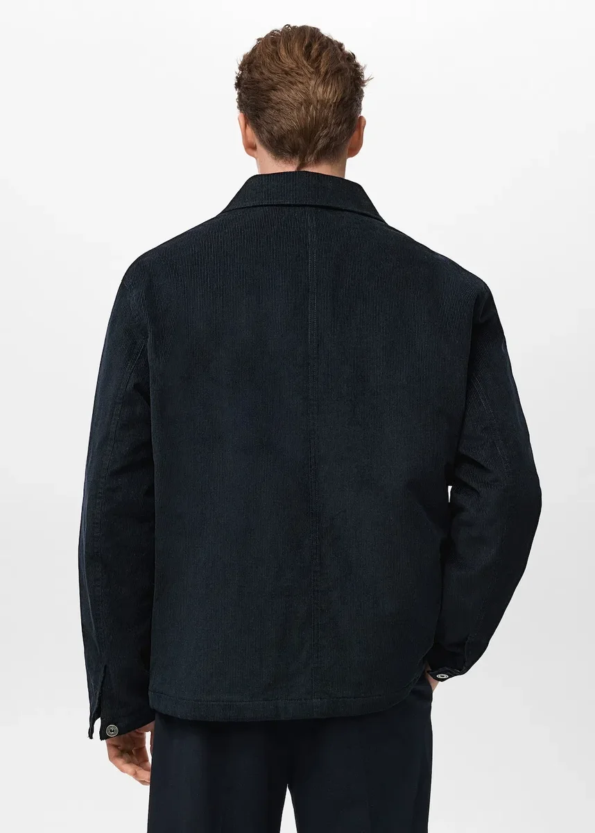 Prosty krój. Tkanina z mieszanki bawełny. Tkanina sztruksowa. Cztery kieszenie z przodu. Kołnierzyk koszulowy. Zapięcie z przodu na guziki. Długie rękawy z mankietami zapinanymi na guziki.