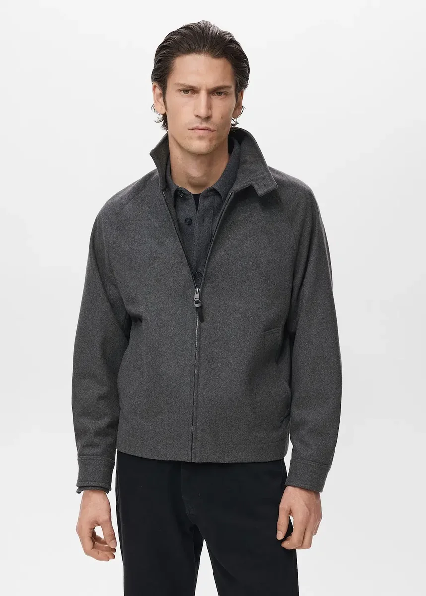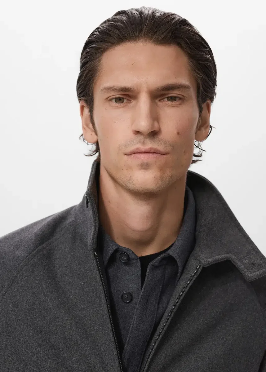 Mieszanka wełny. Prosty krój. Kołnierz z kapturem zapinany na guziki. Dwie naszywane kieszenie boczne. Kieszeń wewnętrzna. Długie rękawy z mankietami zapinanymi na guziki. Zapięcie z przodu na zamek błyskawiczny.