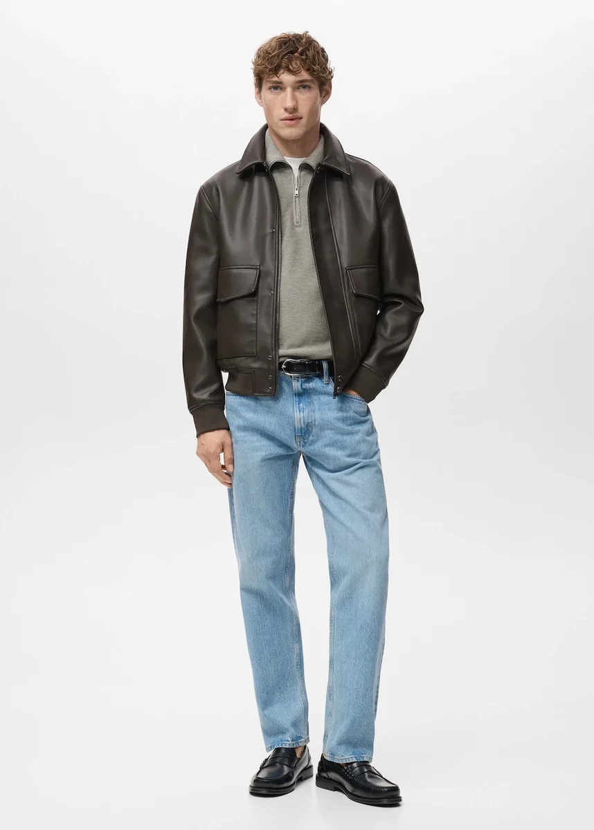 Tkanina ze sztucznej skóry. Prosty krój. Dwie przednie kieszenie. Zapięcie na zamek błyskawiczny i guzik. Długie rękawy. Ściągacze