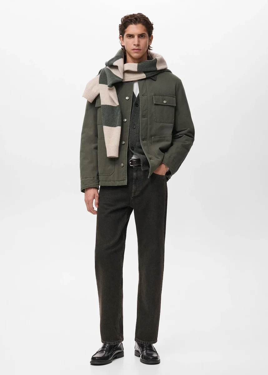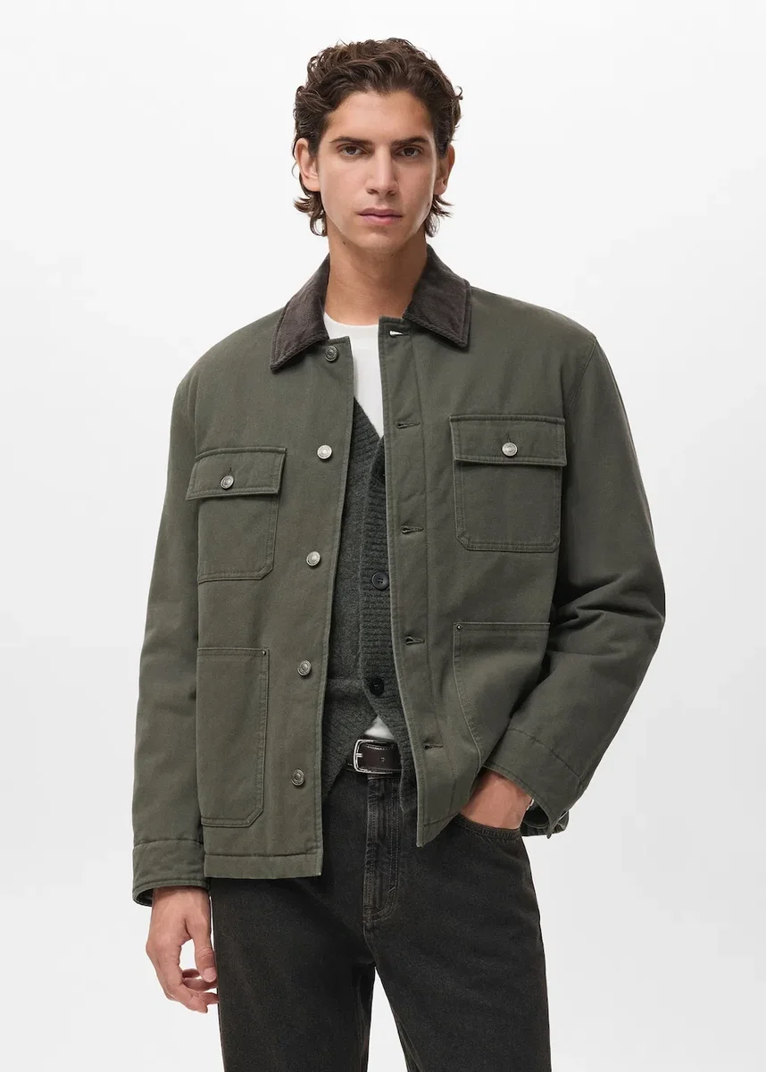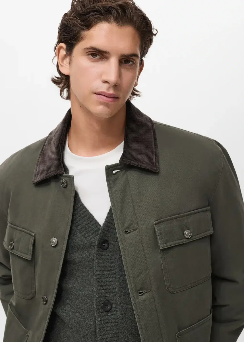 Prosty krój. Materiał bawełniany. Kołnierzyk koszulowy z sztruksu. Dwie naszywane kieszenie z klapką i guzikiem na piersi. Dwie kieszenie z klapką z przodu. Podszewka wewnętrzna. Kieszeń wewnętrzna. Długie rękawy z mankietami zapinanymi na guziki.