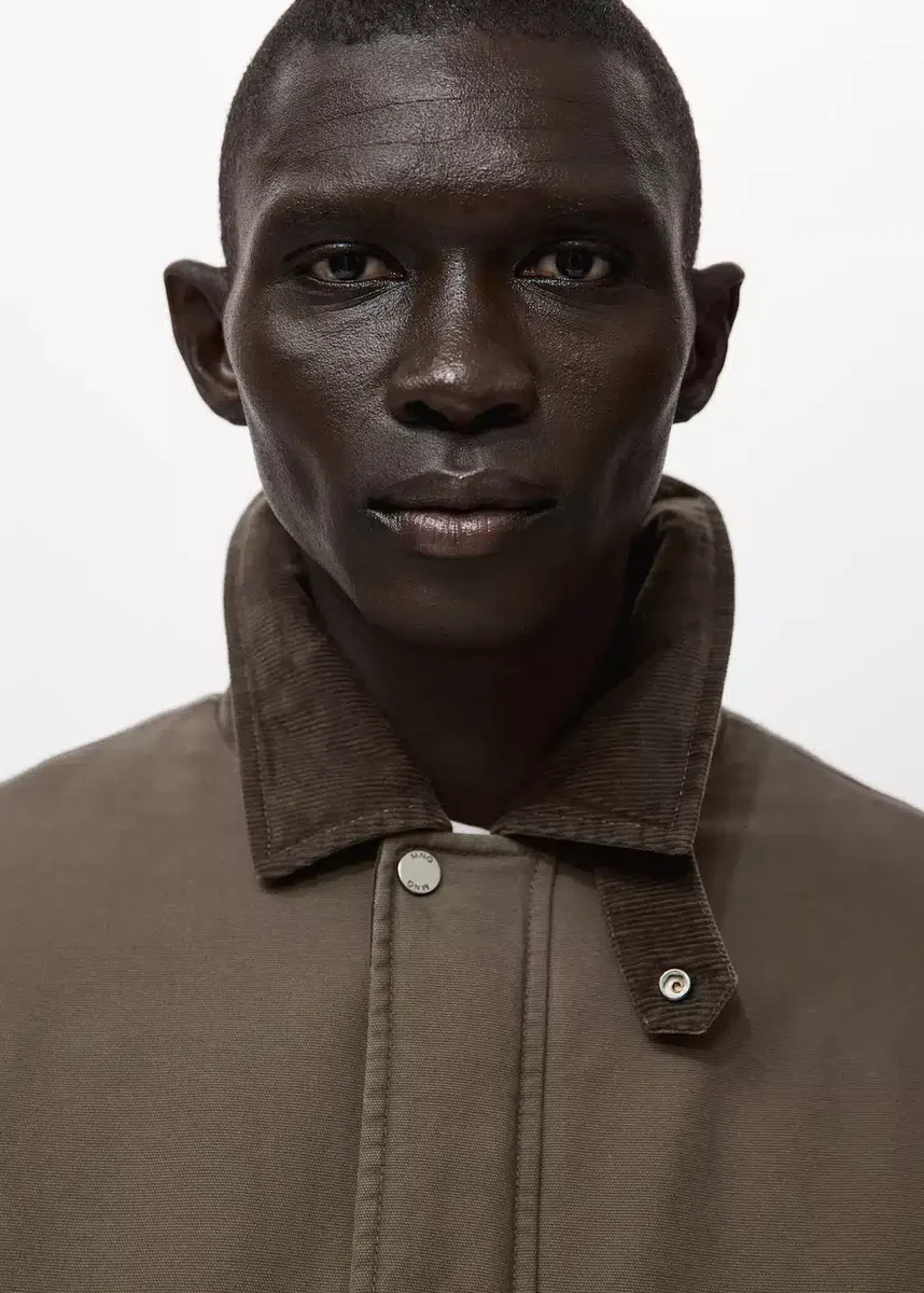 Regularny krój. Tkanina bawełniana. Pikowany wzór. Kołnierz z sztruksu. Dwie boczne kieszenie z klapkami. Kieszeń wewnętrzna. Długie rękawy z mankietami zapinanymi na guziki. Zapięcie z przodu na zamek błyskawiczny i zatrzaski.