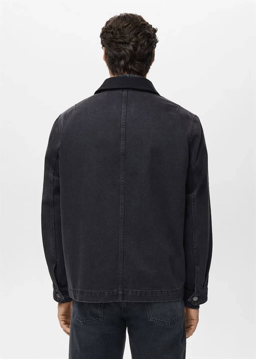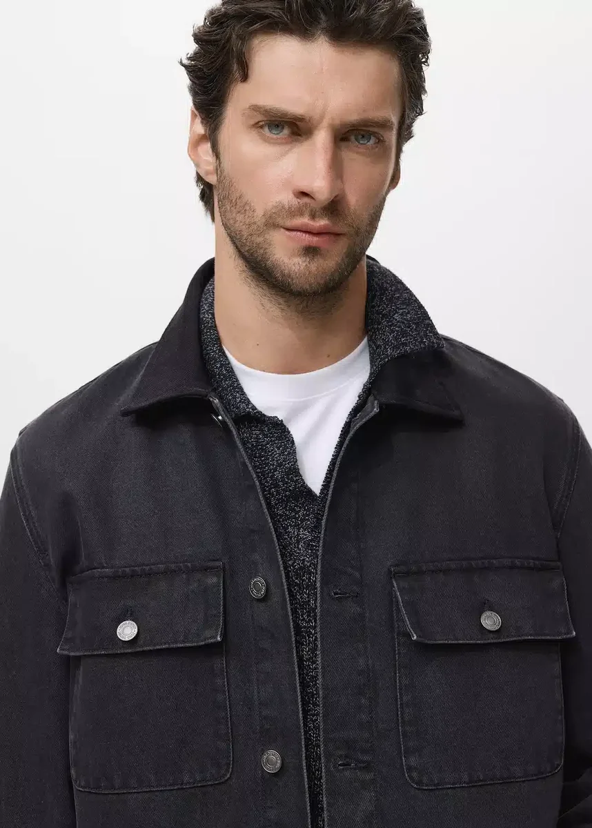 100% bawełna. Prosty krój. Efekt dżinsu. Ciemny kolor. Dwie naszywane kieszenie z klapką i guzikami na piersi. Kieszeń wewnętrzna. Kołnierzyk koszulowy. Zapięcie na guziki. Długie rękawy z mankietami zapinanymi na guziki.