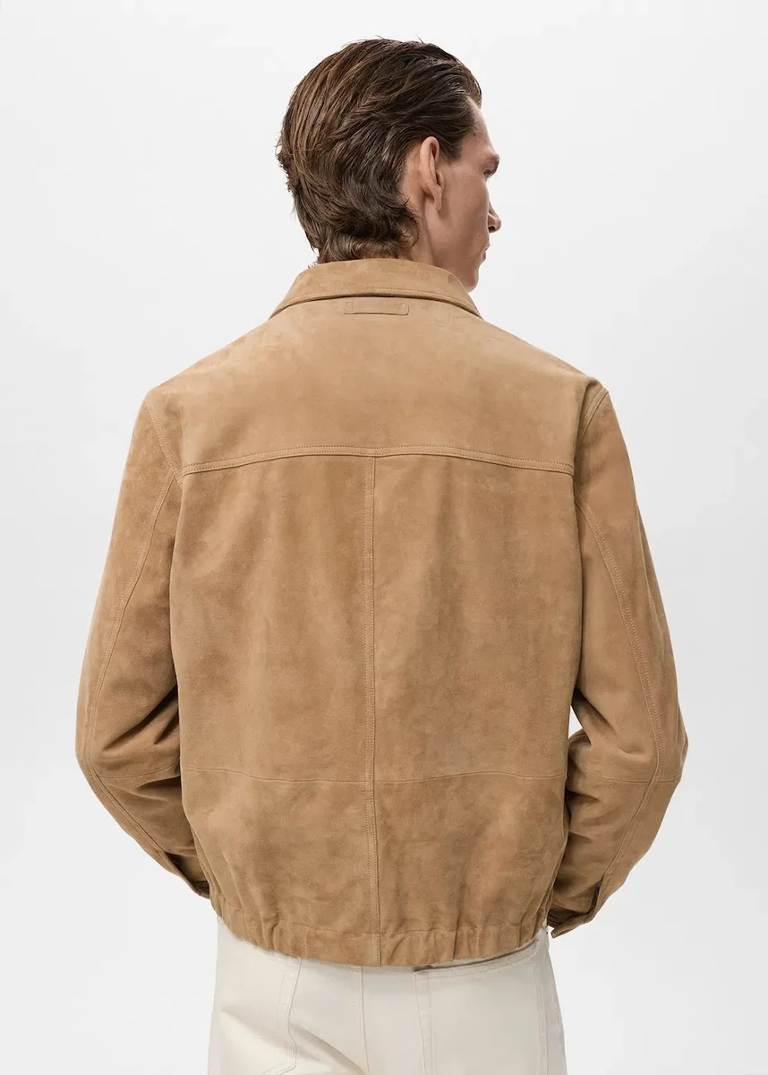 100% skóra zamszowa. Prosty krój. Kołnierzyk koszulowy. Dwie kieszenie na piersi z klapkami. Zapięcie na guziki z przodu. Dół z regulowanym wewnętrznym ściągaczem. Mankiety zapinane na guziki.