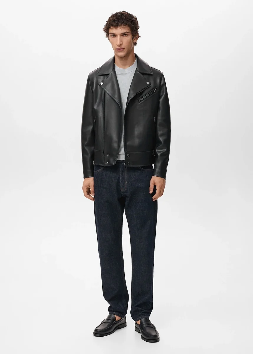 Krój slim fit. Efekt skóry. Kołnierz z wycięciem. Styl motocyklowy. Długie rękawy z zamkiem błyskawicznym przy mankietach. Asymetryczne zapięcie na zamek błyskawiczny. Trzy kieszenie zapinane na zamek błyskawiczny. Kieszeń wewnętrzna. Podszewka wewnętrzna. Regulowany dół z guzikiem