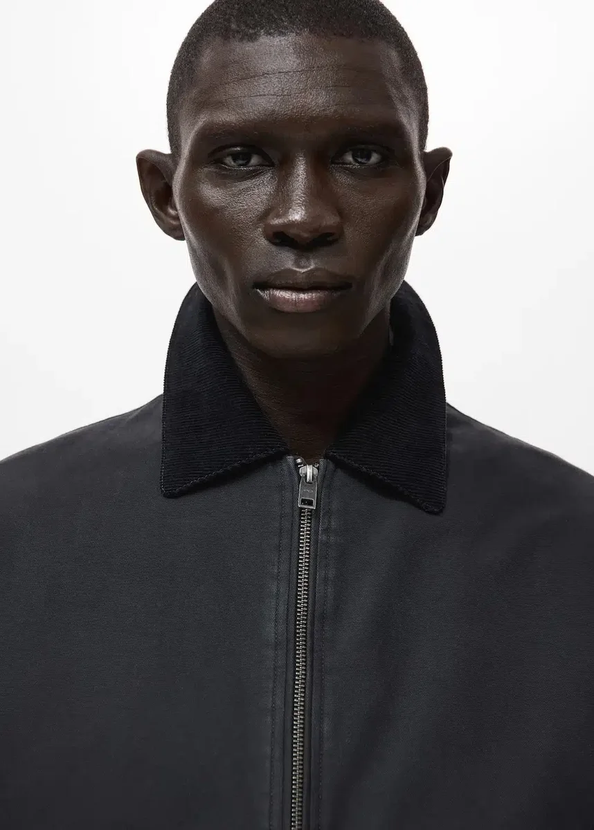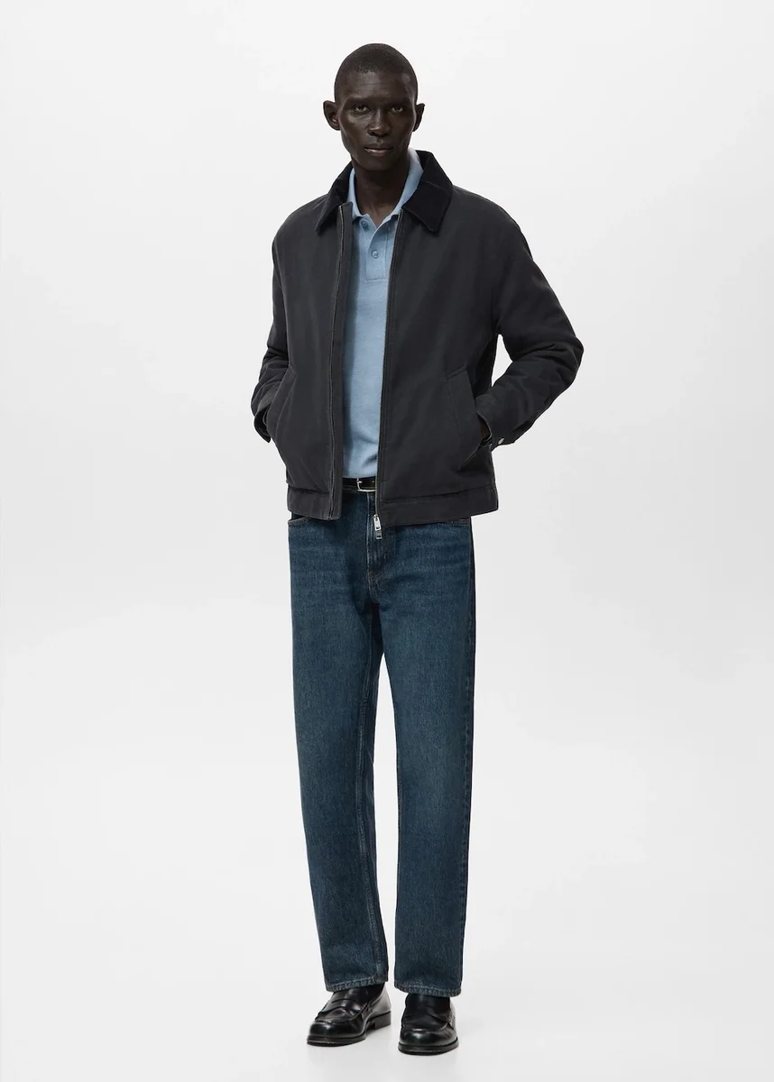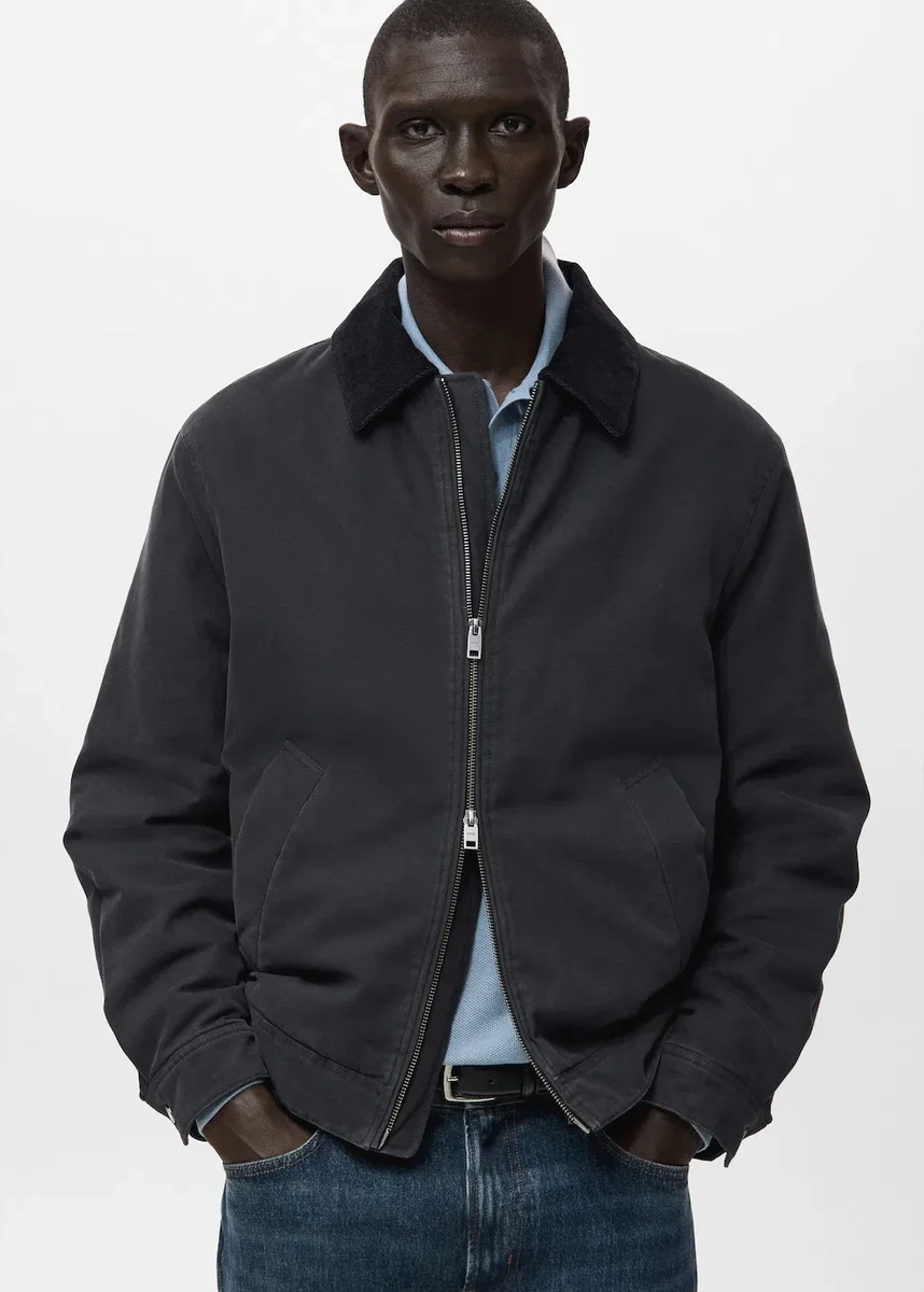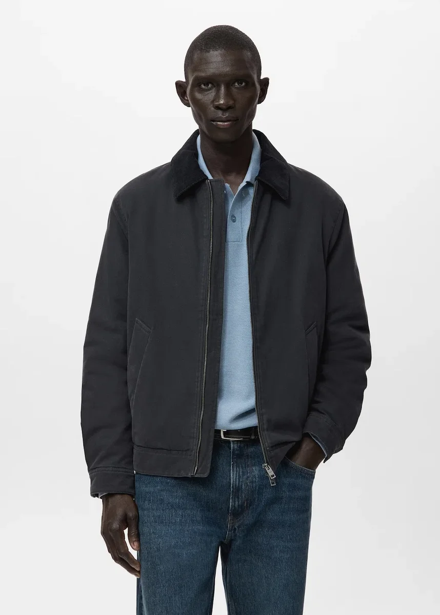 Krój regularny. Bawełniana tkanina dżinsowa. Pikowany wzór. Kołnierz z sztruksu. Dwie boczne kieszenie z wypustką. Długie rękawy z mankietami zapinanymi na guziki. Zamek błyskawiczny dwukierunkowy