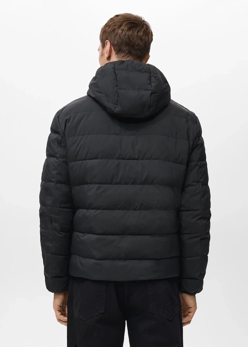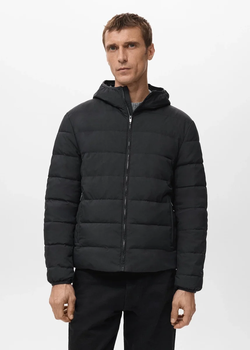 Standardowa długość. Długi rękaw. Prosty krój. Lekka, płaska struktura. Zapięcie z przodu. Kołnierz z klapami. Podszewka z wypełnieniem z pierza. Wodoodporność: techniczna tkanina wodoodporna. Pikowany wzór. Wypełnienie 70/30 puch i pierze. Stójka. Z kapturem. Zapięcie na zamek błyskawiczny z przodu. Dwie przednie kieszenie z zamkiem błyskawicznym. Wewnętrzna kieszeń z zamkiem błyskawicznym. Długi rękaw. Prosty dół. Podszewka wewnętrzna. Możliwość spakowania: odzież posiada wewnętrzną kieszeń do przechowywania.