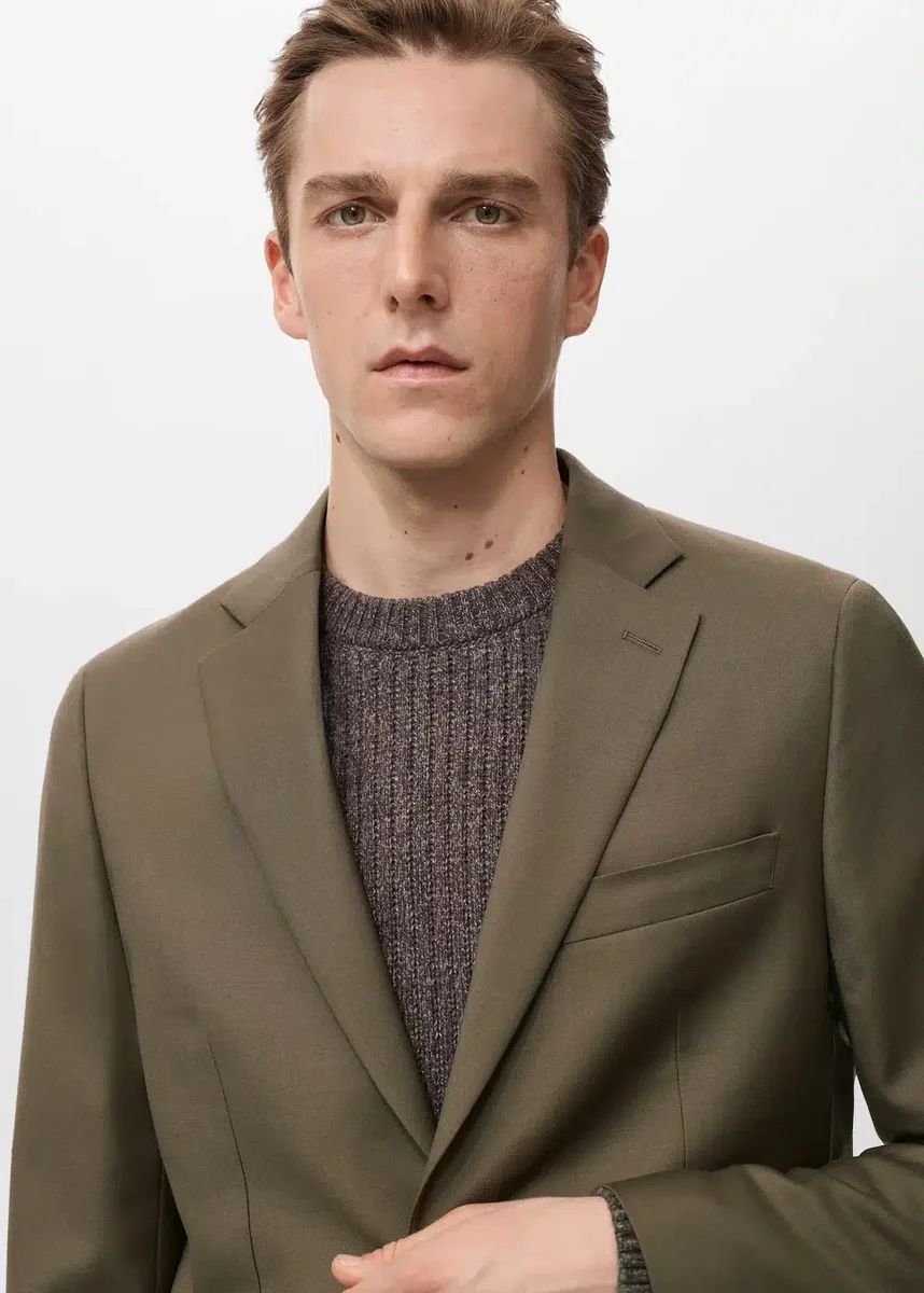 Krój slim fit. 100% dziewicza wełna. Kieszeń na piersi. Dwie kieszenie z boku. Dwa rozcięcia z tyłu. Podszewka wewnętrzna