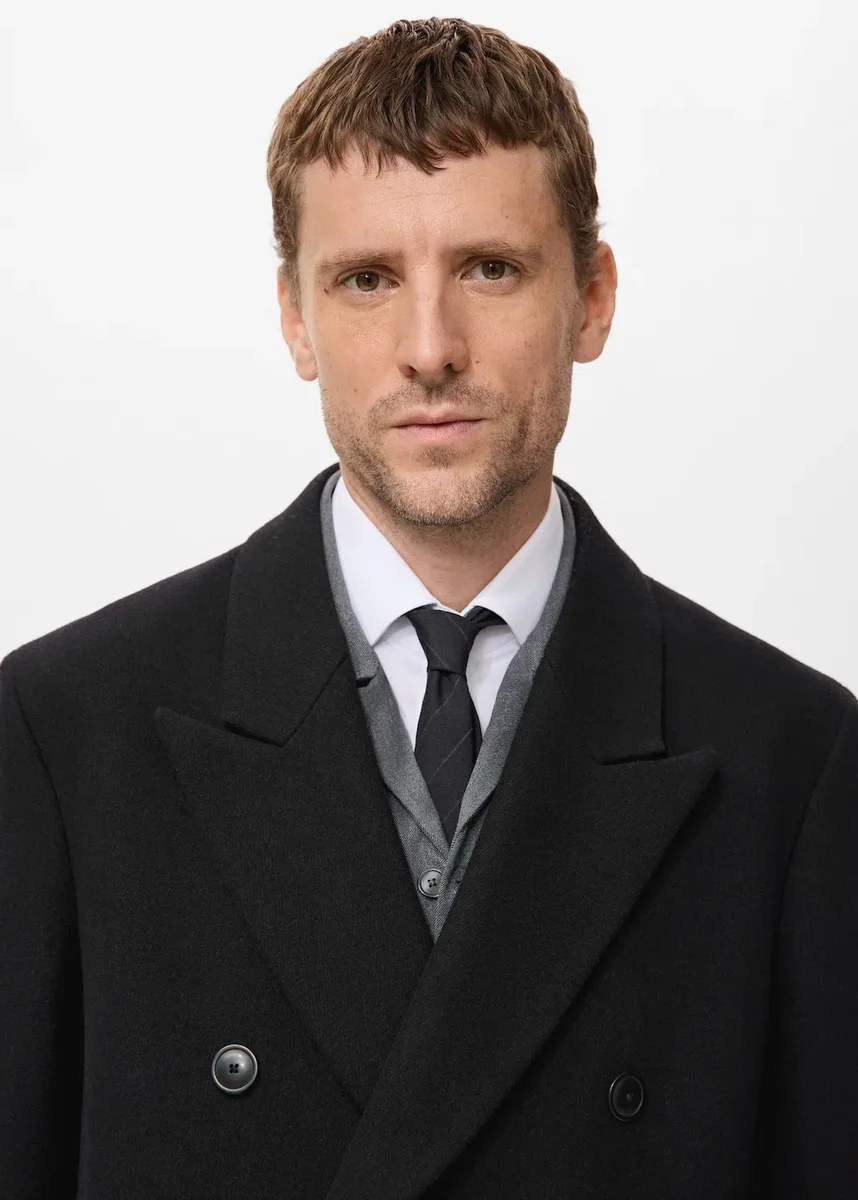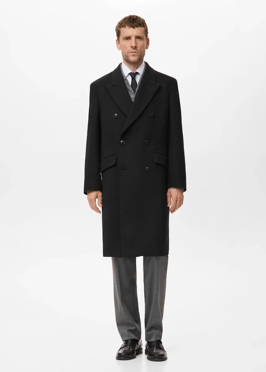 Kolekcja imprezowa. Prosty krój. Mieszanka wełny. Projekt z dwurzędowym zapięciem z przodu. Kołnierz z wycięciem. Dwie kieszenie z klapkami z przodu. Długie rękawy z mankietami zapinanymi na guziki. Rozcięcie w środkowej części rąbka. Podszewka wewnętrzna