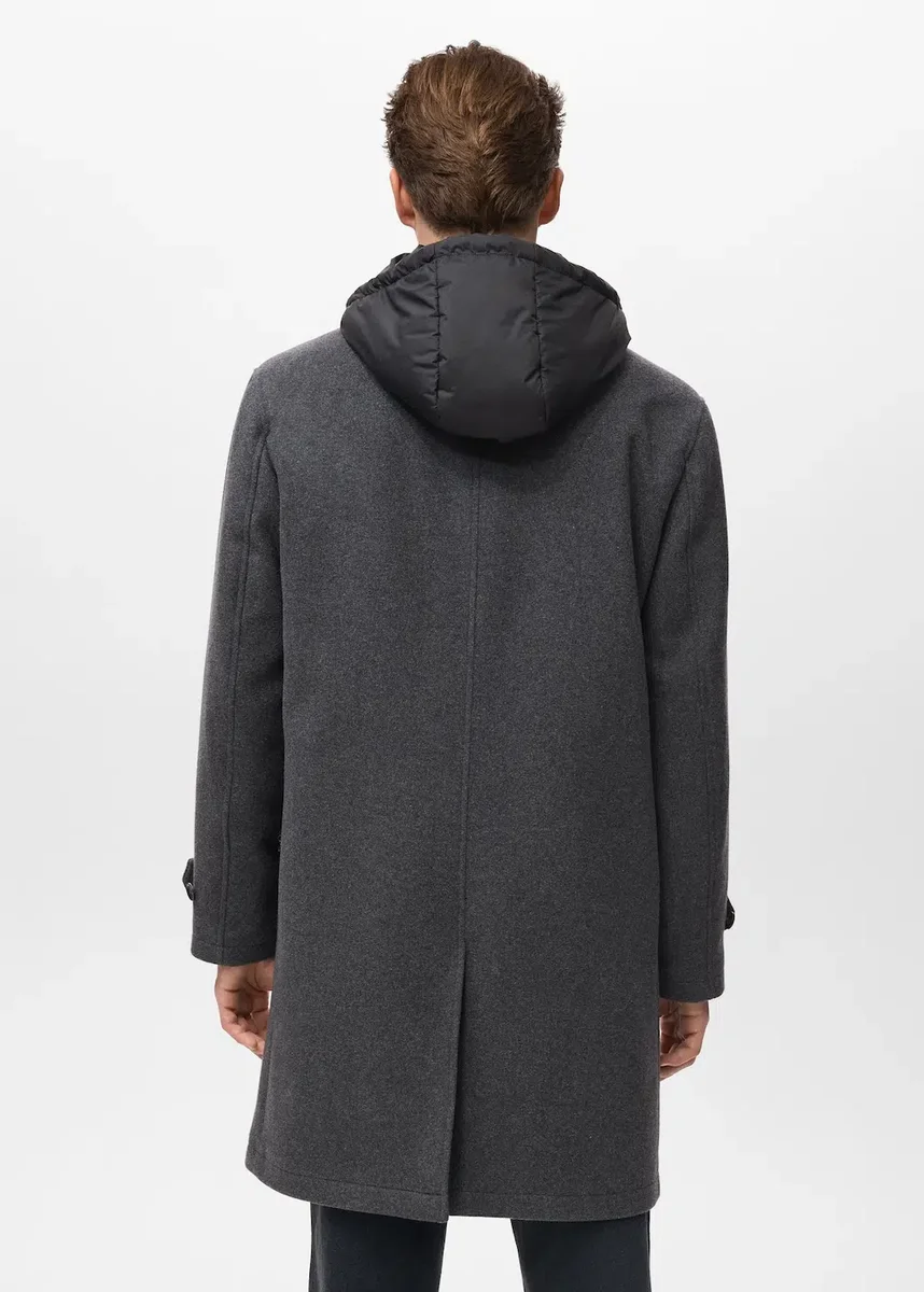 Kolor szary jest dostępny wyłącznie w sprzedaży internetowej. Materiał z domieszką wełny. Prosty krój. Odpinany kaptur. Zapięcie na zamek błyskawiczny. Rozcięcie z tyłu u dołu. Zapięcie na guziki z przodu.