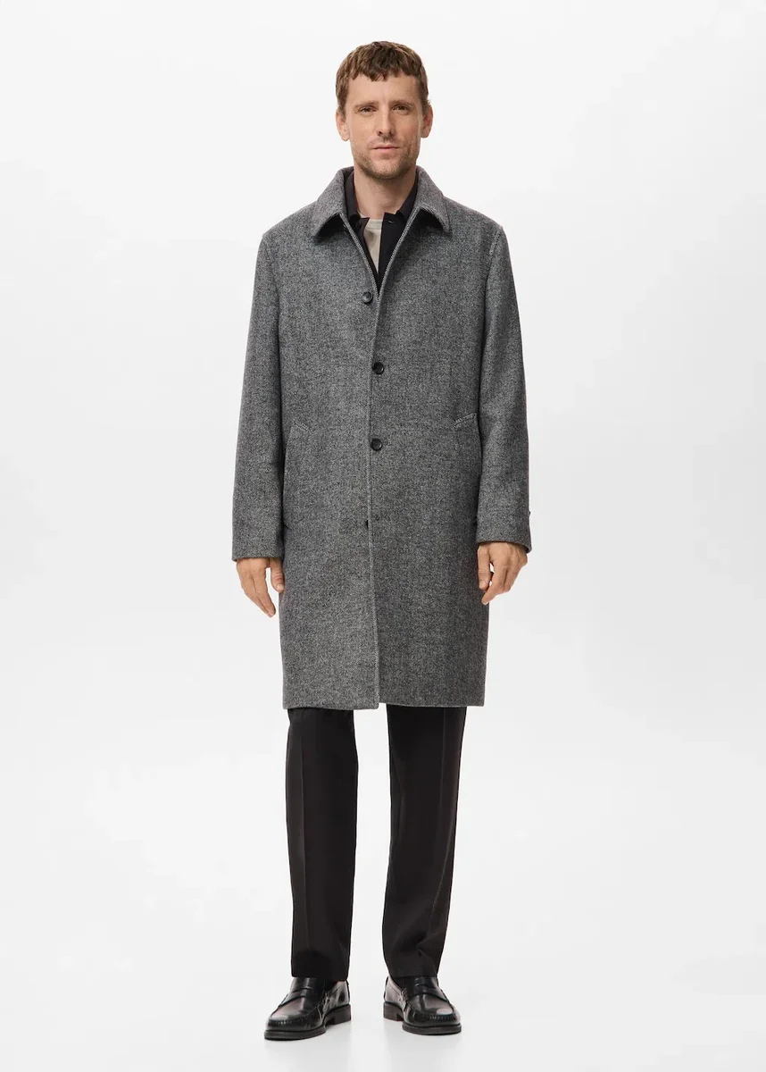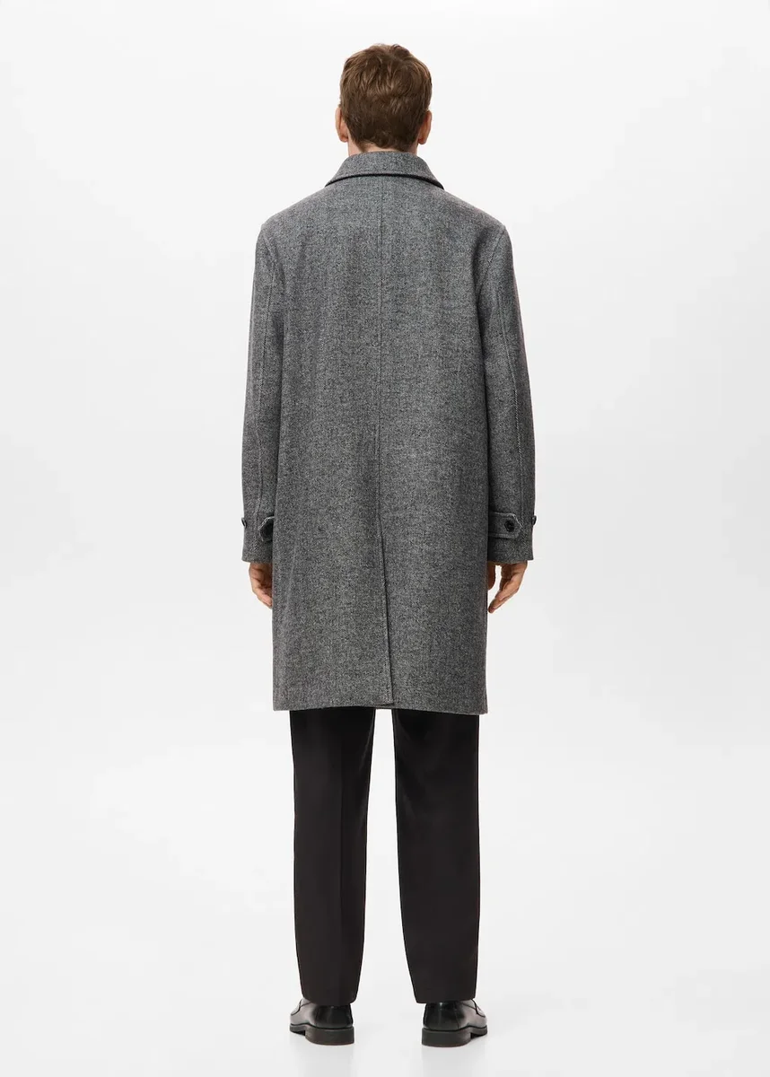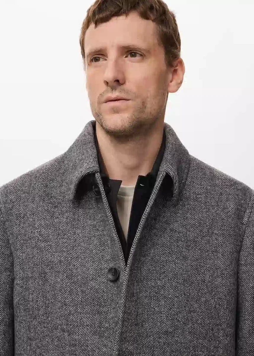 Kolekcja imprezowa. Mieszanka wełny. Prosty krój. Struktura w jodełkę. Kołnierz z wycięciem. Dwie kieszenie boczne. Z podszewką wewnętrzną. Długie rękawy z mankietami zapinanymi na guziki. Rozcięcie z tyłu u dołu. Zapięcie na guziki z przodu.