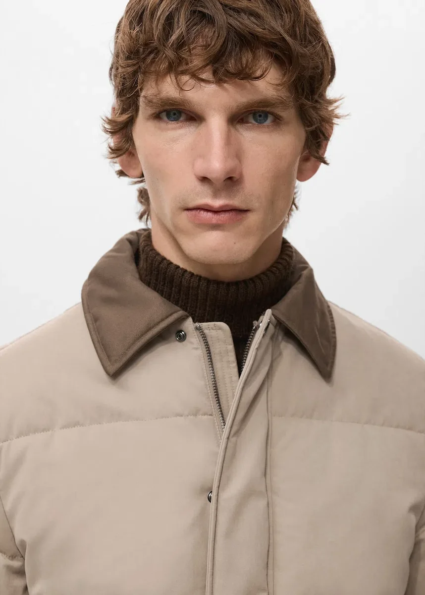 Krój regularny. Wodoodporność: techniczna tkanina wodoodporna. Pikowany wzór. Kontrastowy dekolt w szpic. Dwie kieszenie boczne zapinane na zatrzask. Wewnętrzna kieszeń z wypustką. Długie rękawy z mankietami zapinanymi na guziki. Zapięcie z przodu na zamek błyskawiczny i zatrzask.