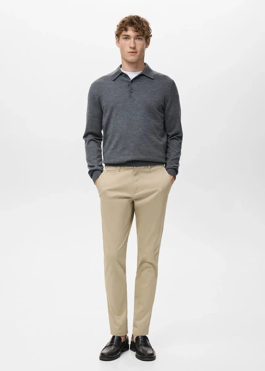 Styl chino. Krój zwężany: szeroki u góry, zwężający się od kolan do kostek. Tkanina bawełniana. Szlufki. Talia z regulowanym wewnętrznym sznurkiem. Zapięcie na zamek błyskawiczny i guzik. Miękka gumka z przodu w pasie dla dodatkowego komfortu i wsparcia rosnącego brzuszka. Kieszeń na monety na wysokości bioder. Dwie kieszenie z przodu. Dwie kieszenie z klapkami zapinanymi na guziki z tyłu. Wąski krój. Regularny stan. Standardowa długość.