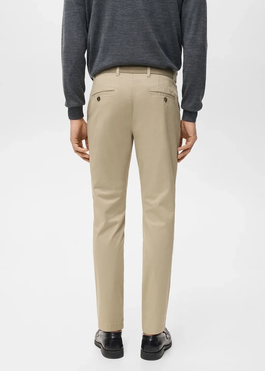 Styl chino. Krój zwężany: szeroki u góry, zwężający się od kolan do kostek. Tkanina bawełniana. Szlufki. Talia z regulowanym wewnętrznym sznurkiem. Zapięcie na zamek błyskawiczny i guzik. Miękka gumka z przodu w pasie dla dodatkowego komfortu i wsparcia rosnącego brzuszka. Kieszeń na monety na wysokości bioder. Dwie kieszenie z przodu. Dwie kieszenie z klapkami zapinanymi na guziki z tyłu. Smukła sylwetka. Regularna wysokość talii. Standardowa długość